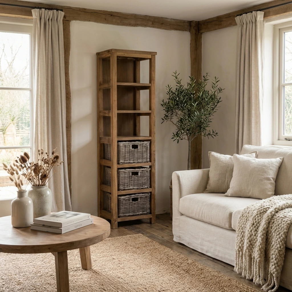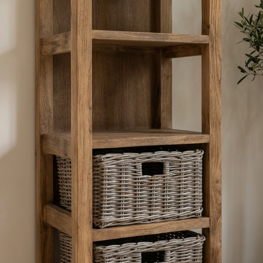 160cm Reclaimed Teak & Natural Kubu Wicker Tall Storage Unit with 3 Kubu Wicker Baskets & 3 Shelves