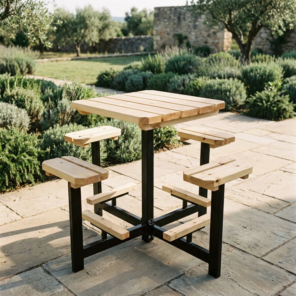 Square 4 Seater Tanalised FSC Certified Swedish Redwood and Powder Coated Steel Bar Table with 4 Stools
