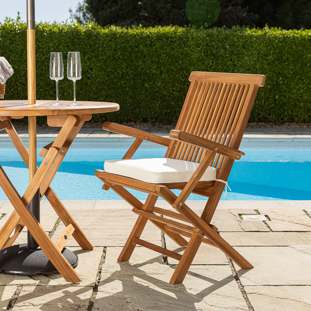 Two Certified Teak Outdoor Folding Dining Armchairs with Free CushionsIn stock