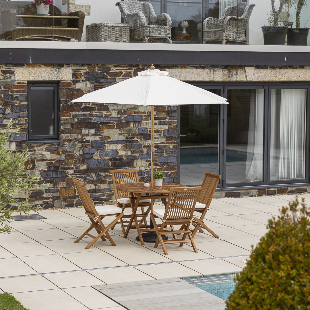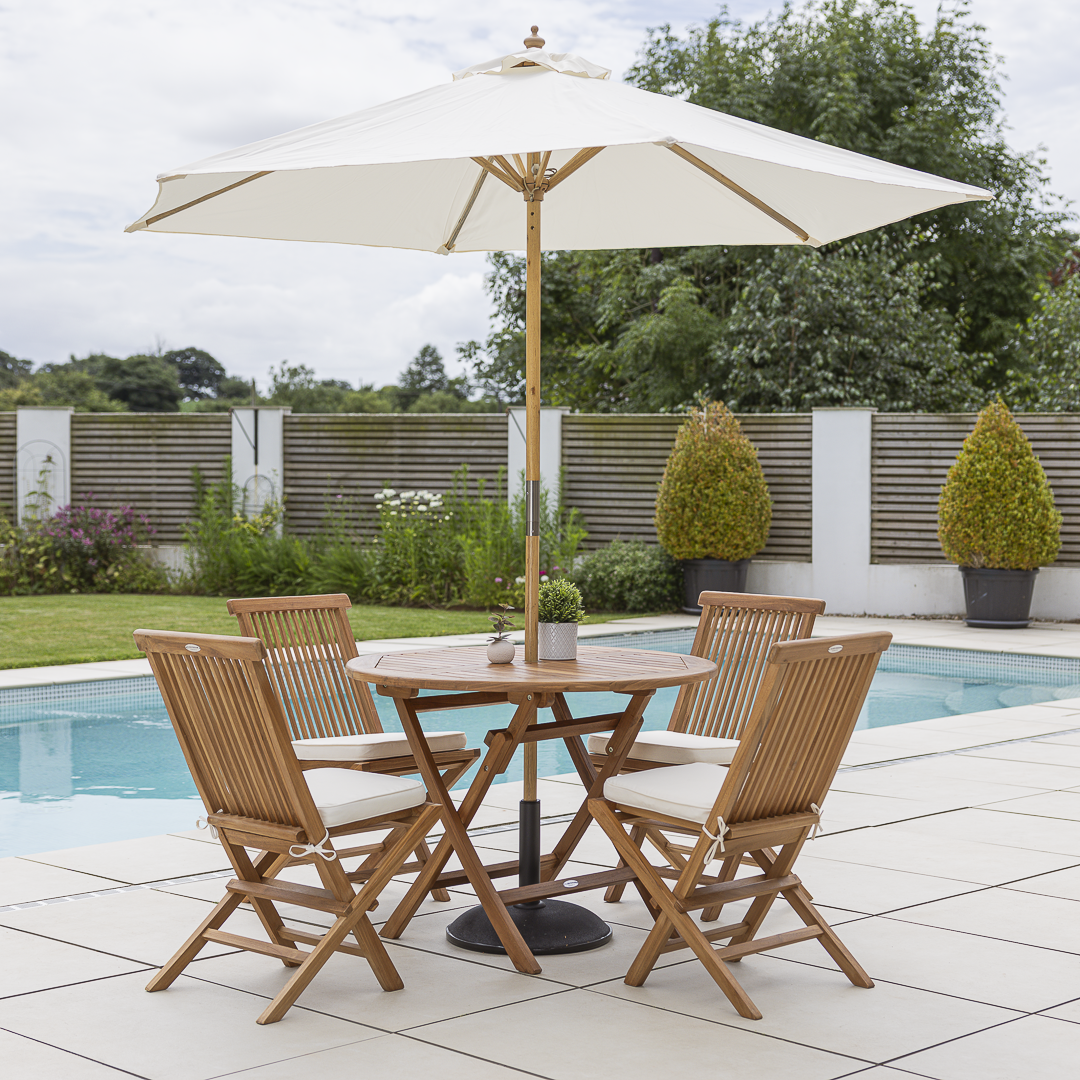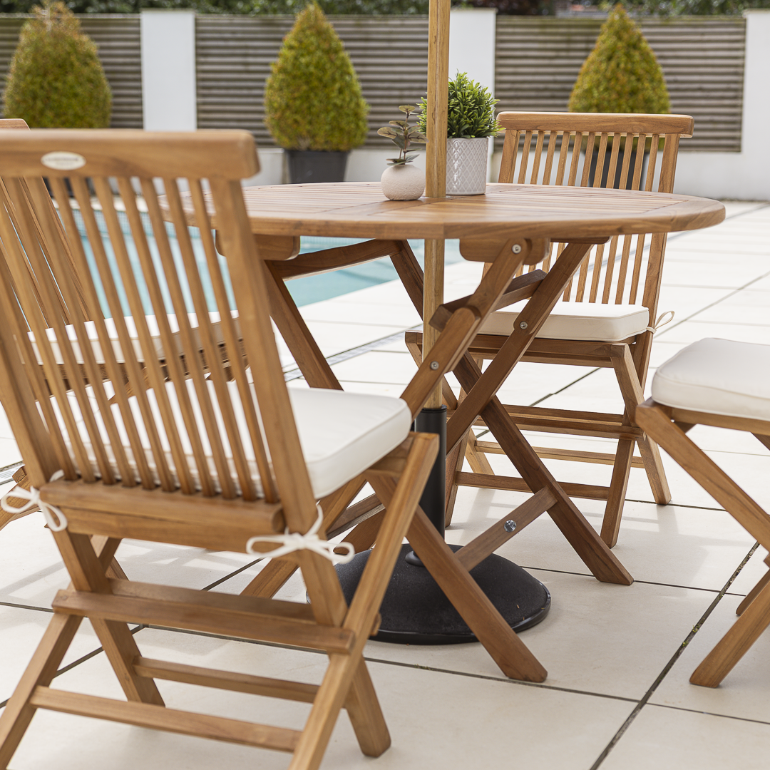 120cm Circular Certified Teak Folding Outdoor Dining Table with 4 Cora Folding Chairs