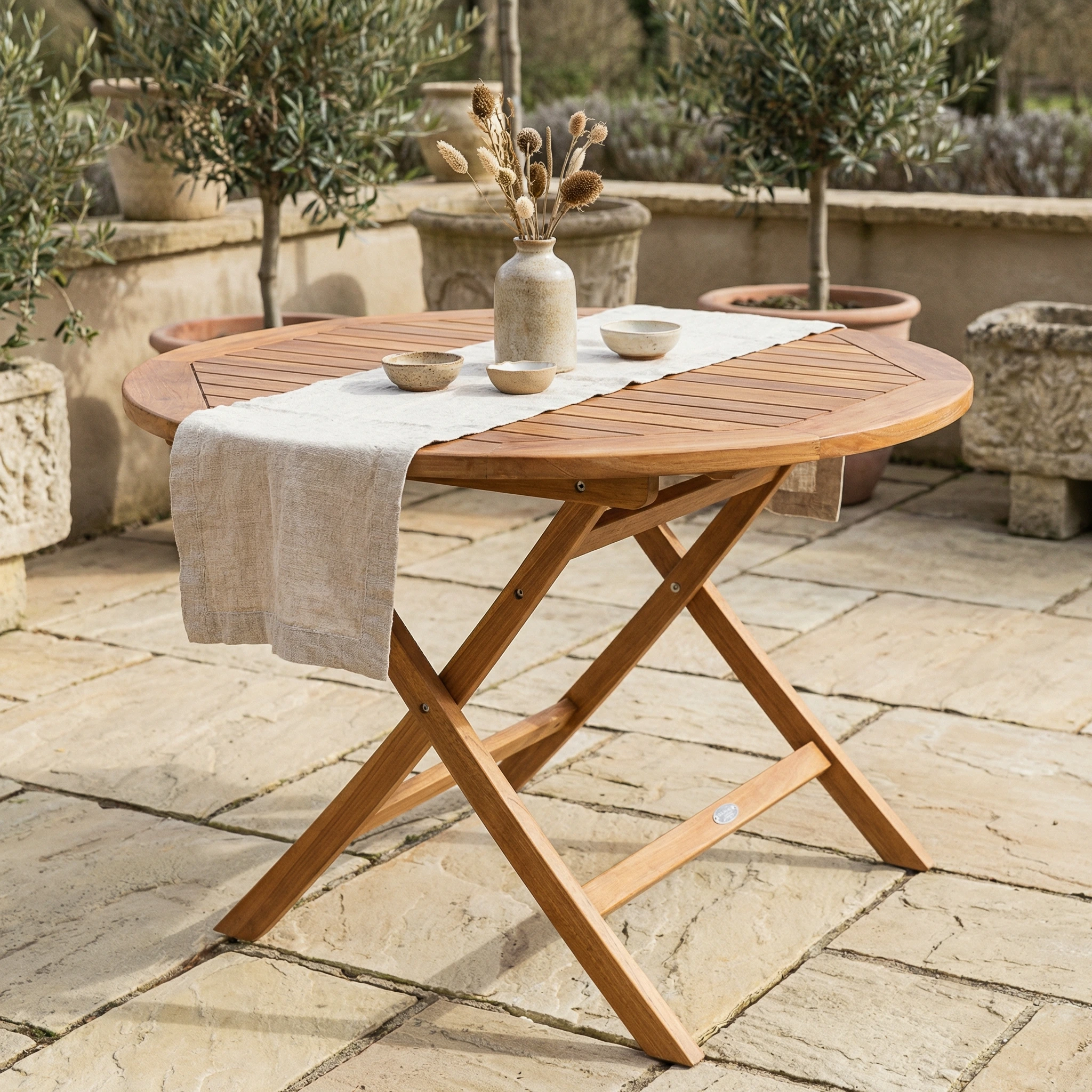160cm Oval Certified Teak Outdoor Dining Table with 4 or 6 Cora Teak Folding ChairsIn stock
