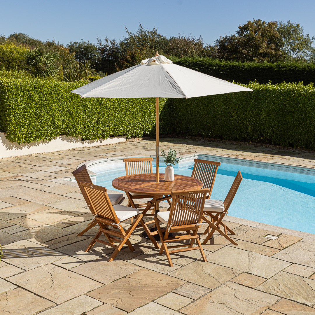 120cm Circular Certified Teak Folding Outdoor Dining Table with 6 Cora Folding Chairs