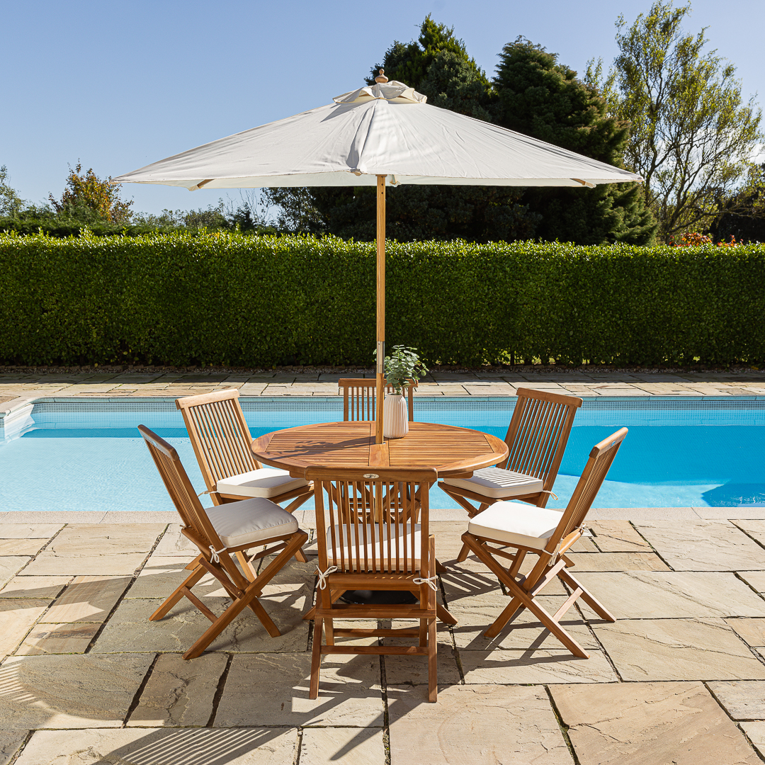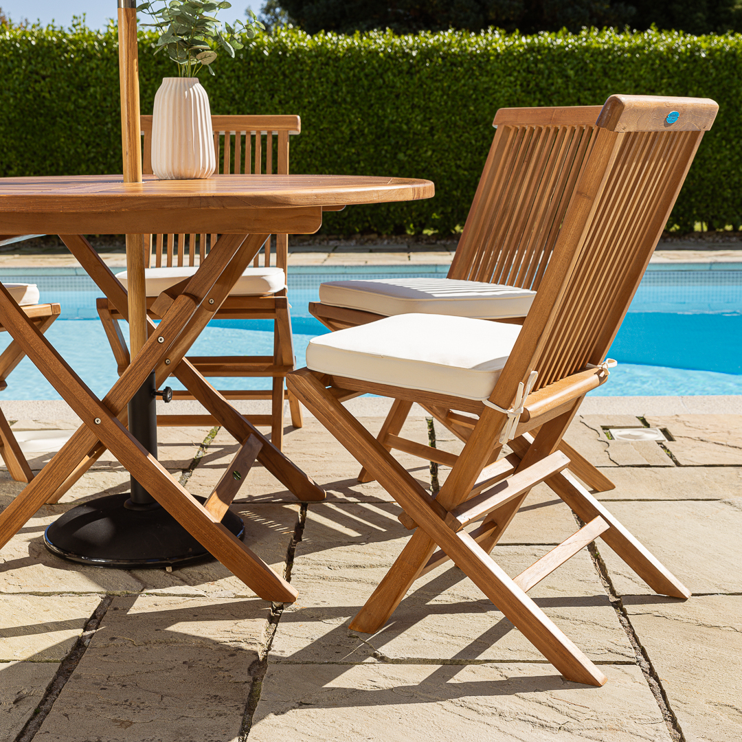 120cm Circular Certified Teak Folding Outdoor Dining Table with 4 Cora Folding ChairsIn stock