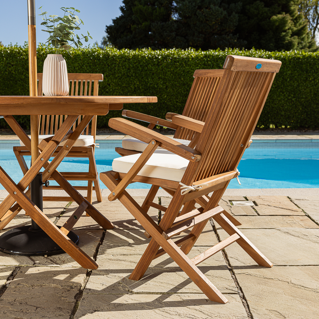 Two Certified Teak Outdoor Folding Dining Armchairs with Free CushionsIn stock