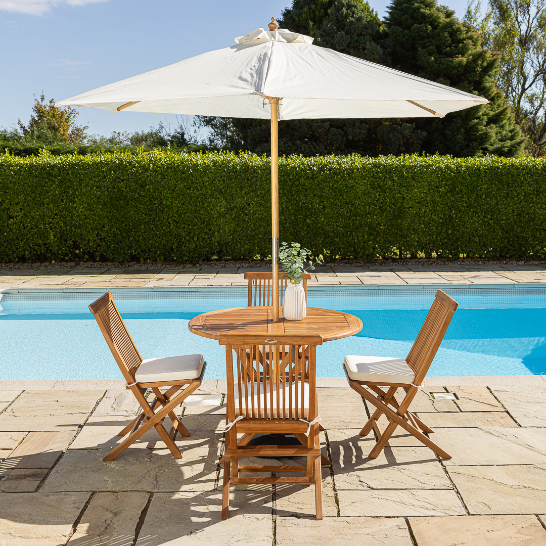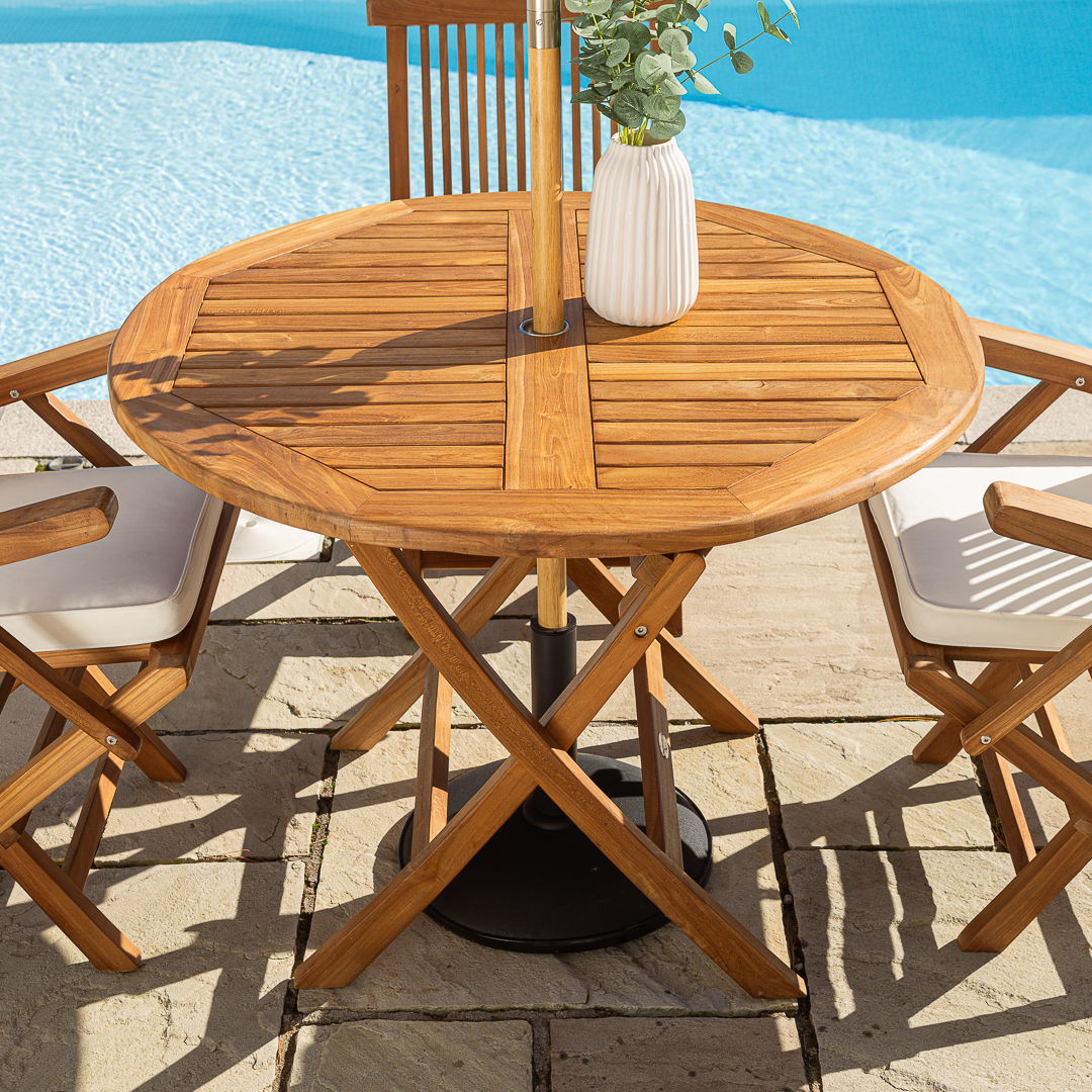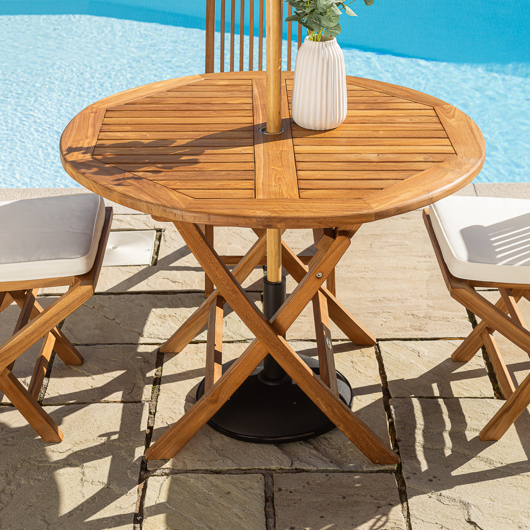 100cm Circular Certified Teak Folding Outdoor Dining Table with 4 Cora Folding Chairs