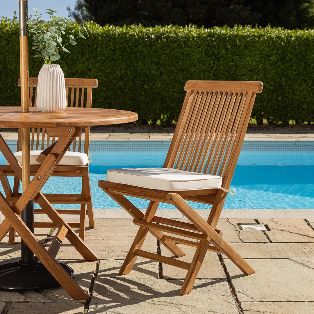 120cm Circular Certified Teak Folding Outdoor Dining Table with 4 Cora Folding ChairsIn stock
