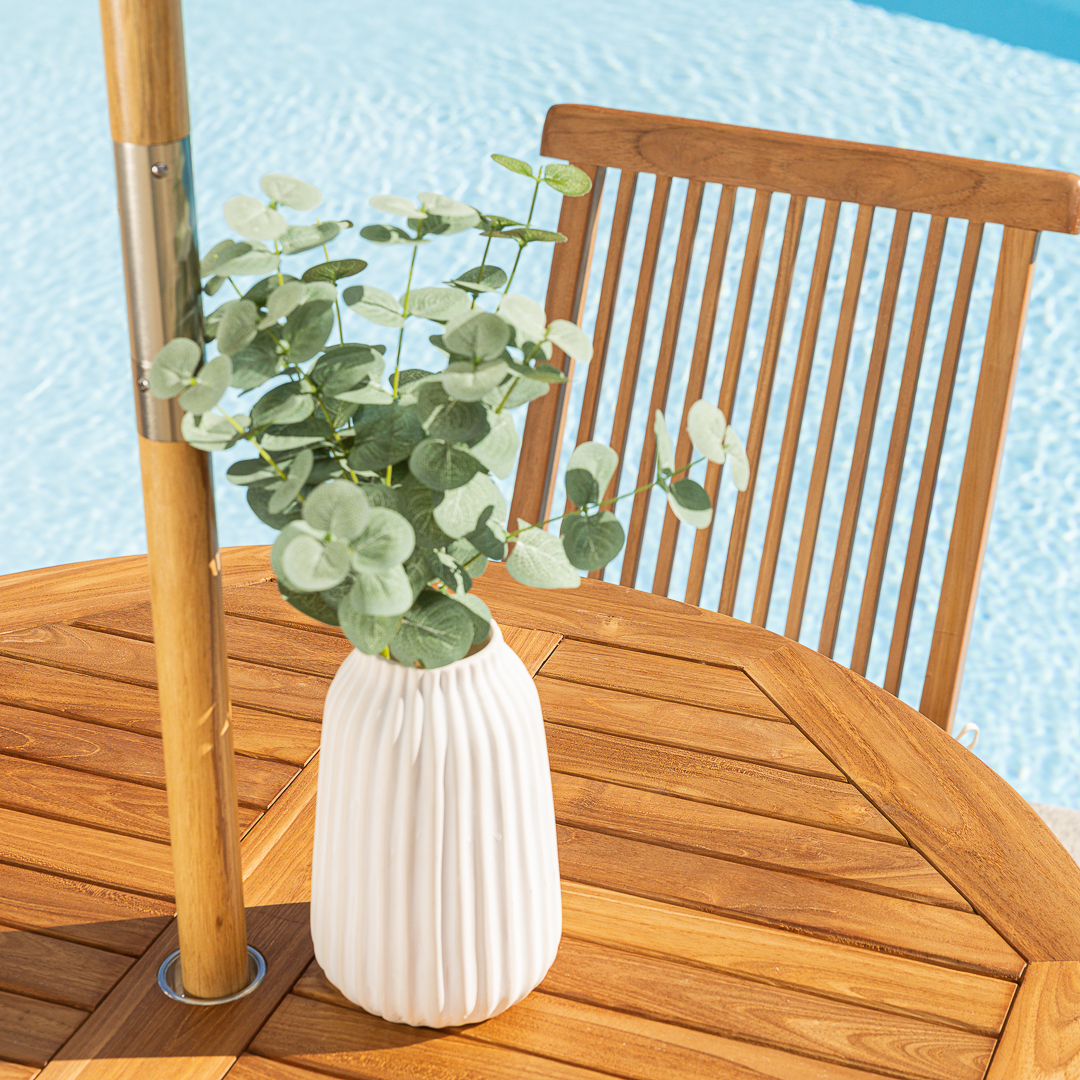 120cm Octagonal Certified Teak Folding Outdoor Dining Table with 4 Marley Teak Stacking ChairsIn stock