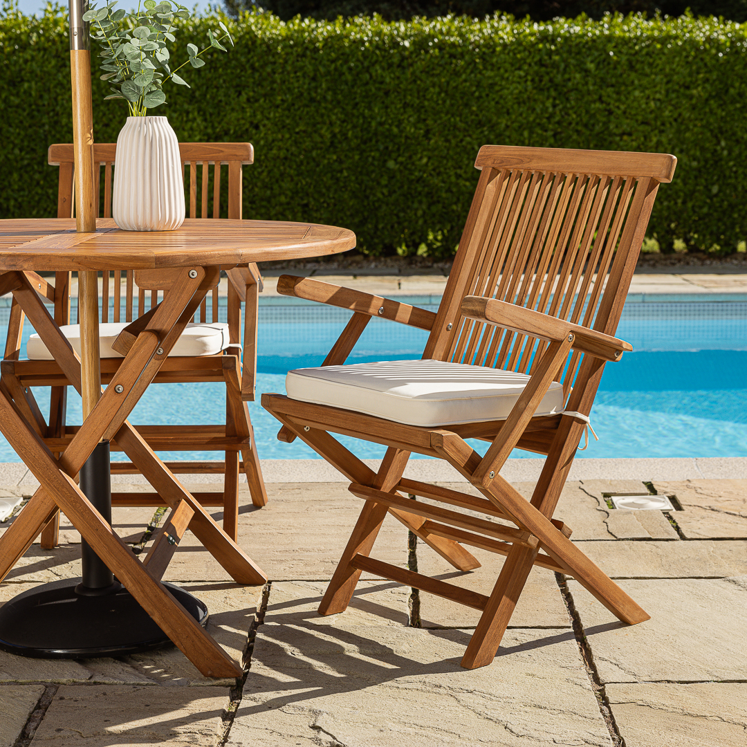 Two Certified Teak Outdoor Folding Dining Armchairs with Free CushionsIn stock