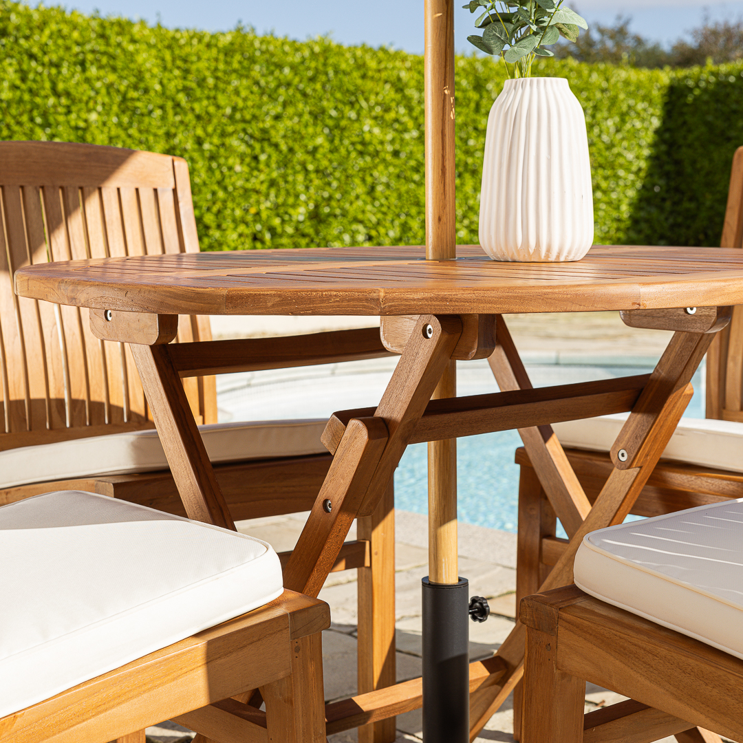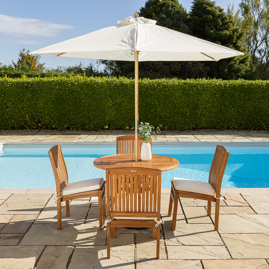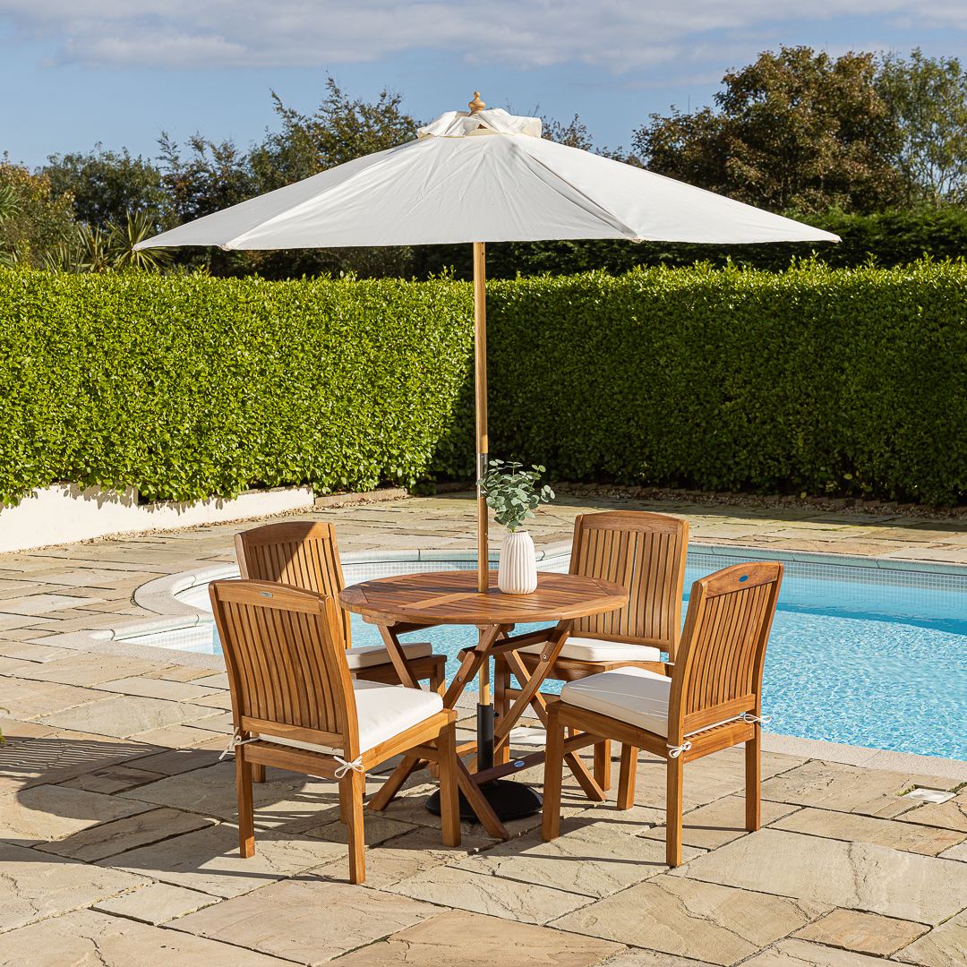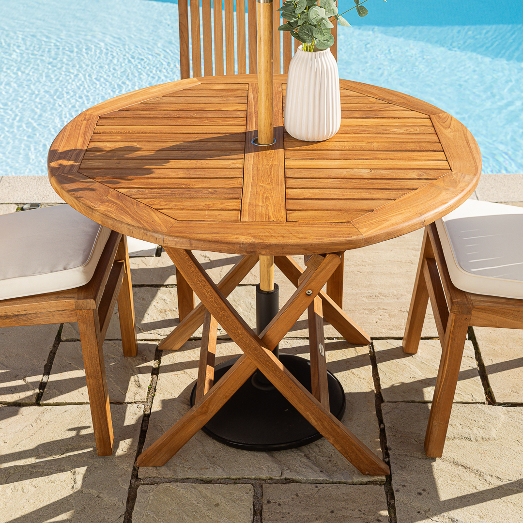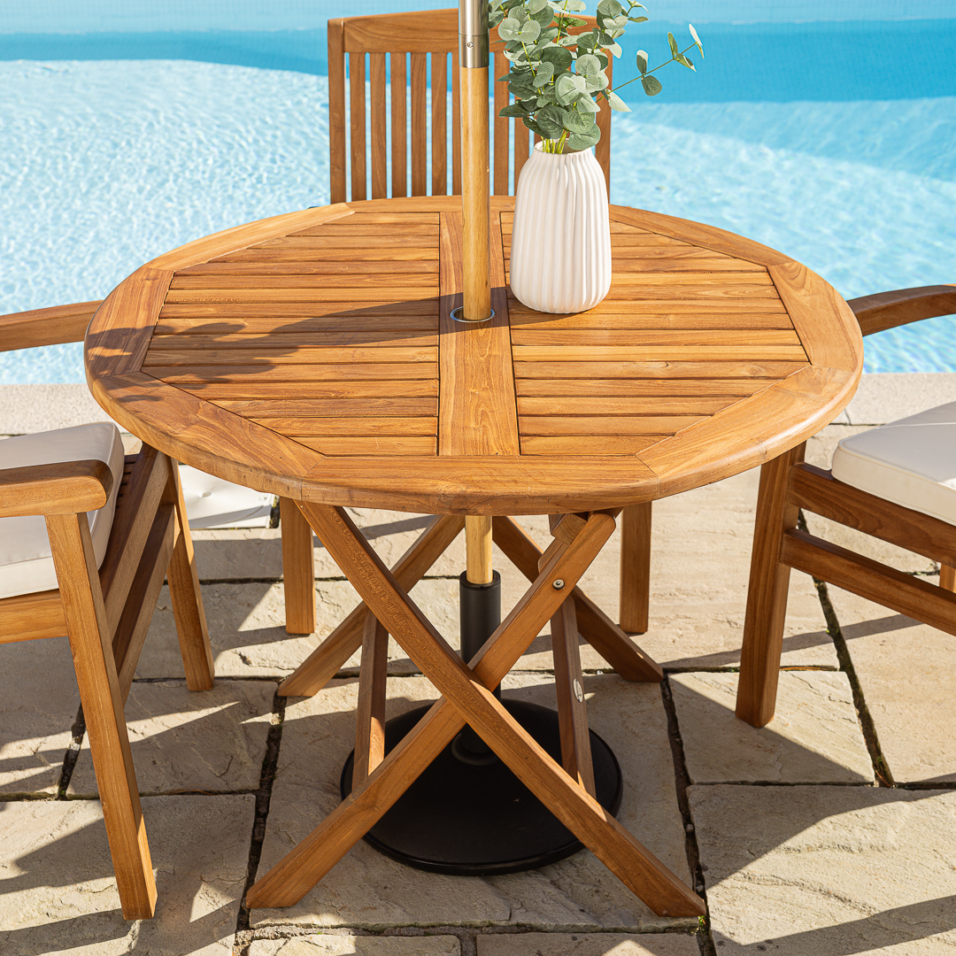 100cm Circular Certified Teak Folding Outdoor Dining Table with 4 Marley Teak Stacking Chairs