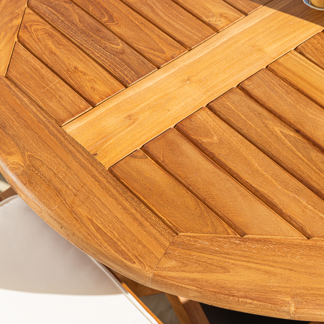 120cm Circular Certified Teak Folding Outdoor Dining Table with 6 Cora Folding ChairsIn stock