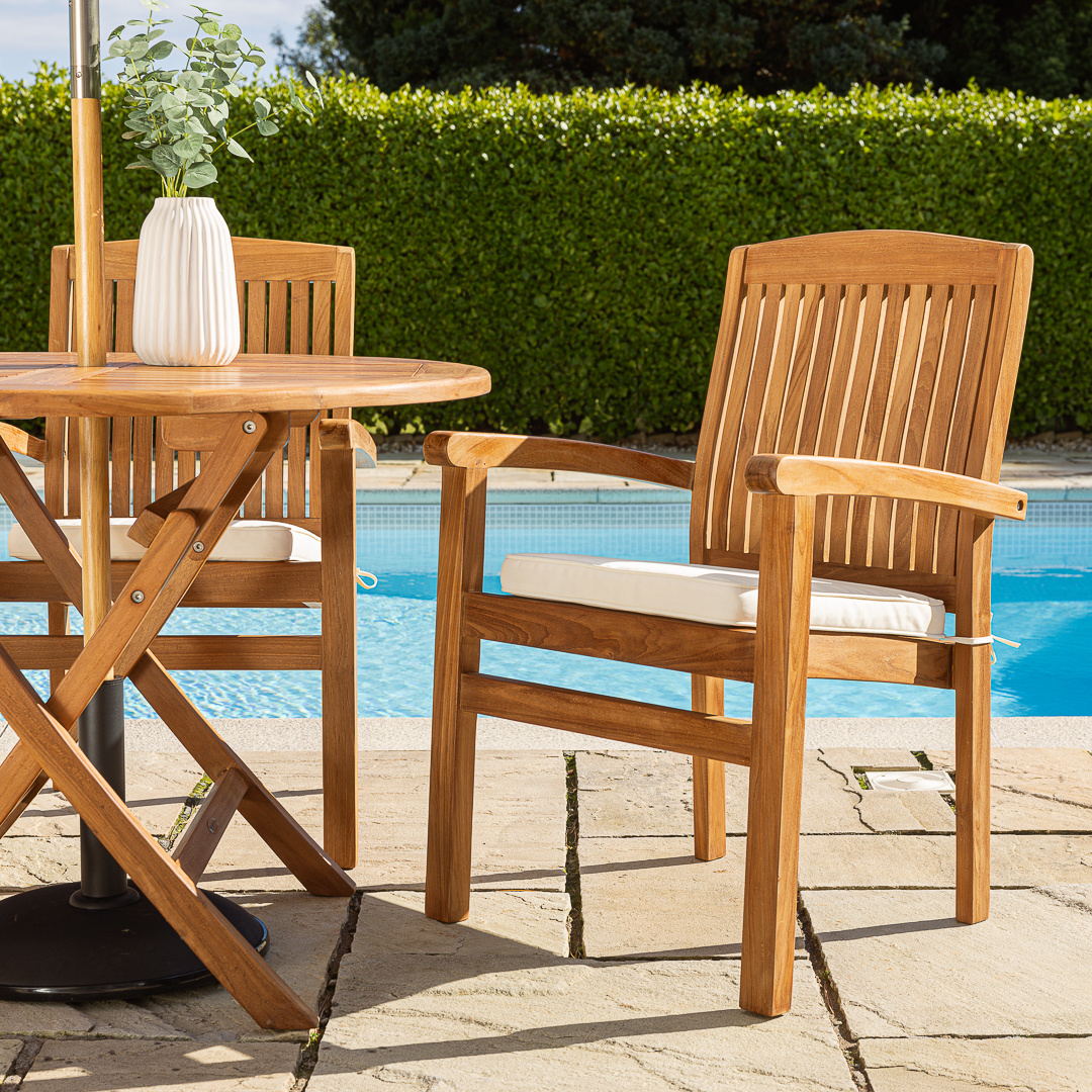 Two Certified Teak Outdoor Folding Dining Armchairs with Free CushionsIn stock