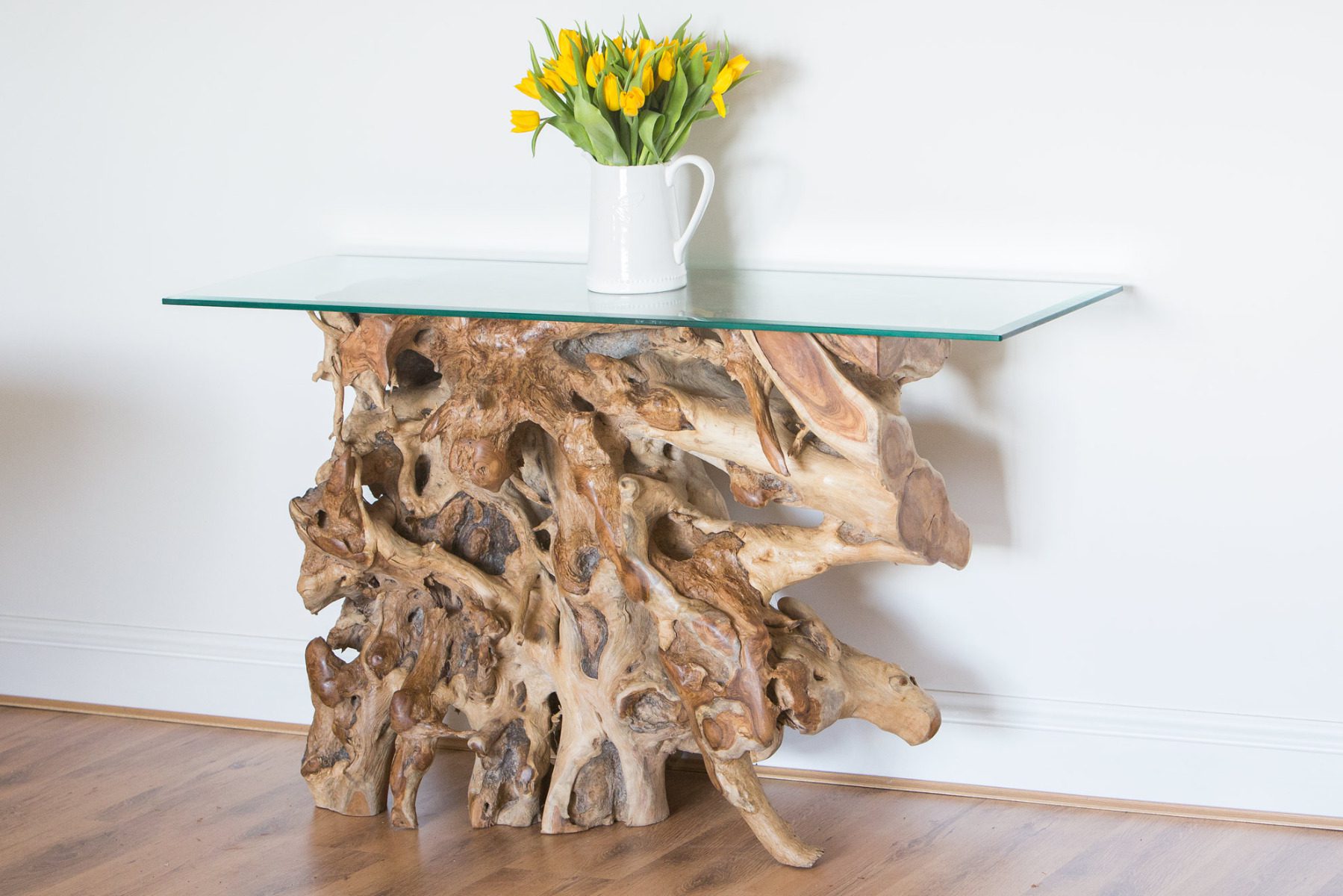 140cm x 45cm Rectangular Reclaimed Teak Root Hall Table with 10mm Toughened Safety GlassIn stock