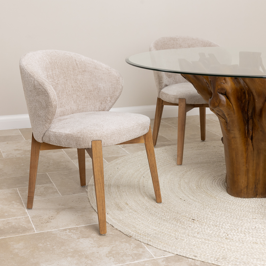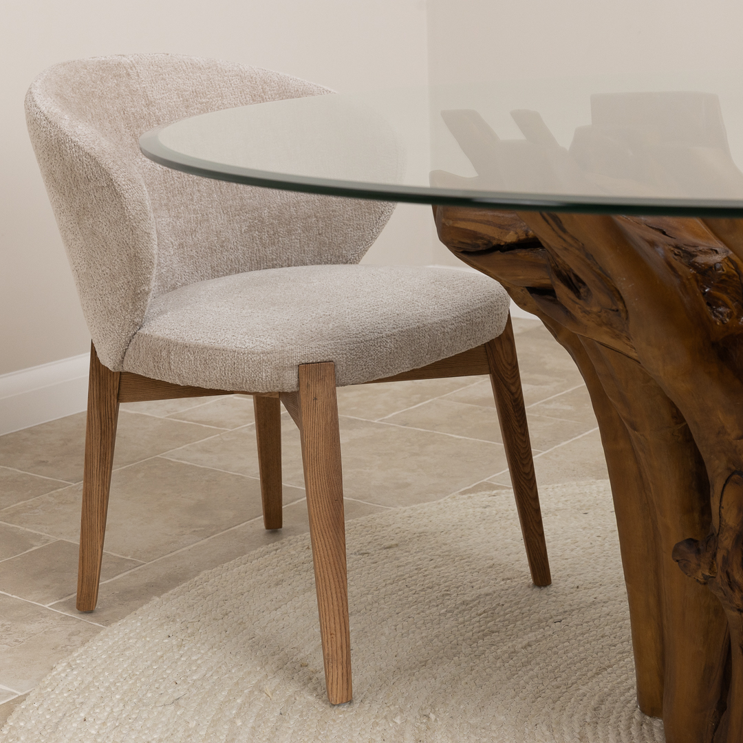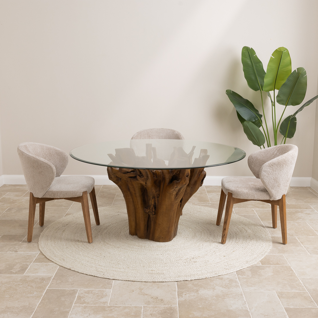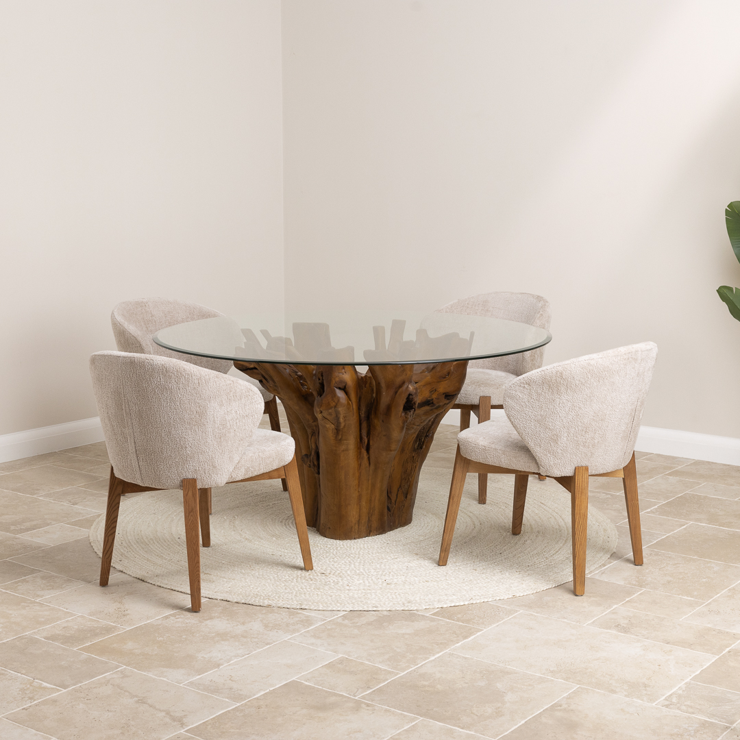 150cm Circular Teak Flute Root Dining Table with 4 Upholstered Cove Chairs