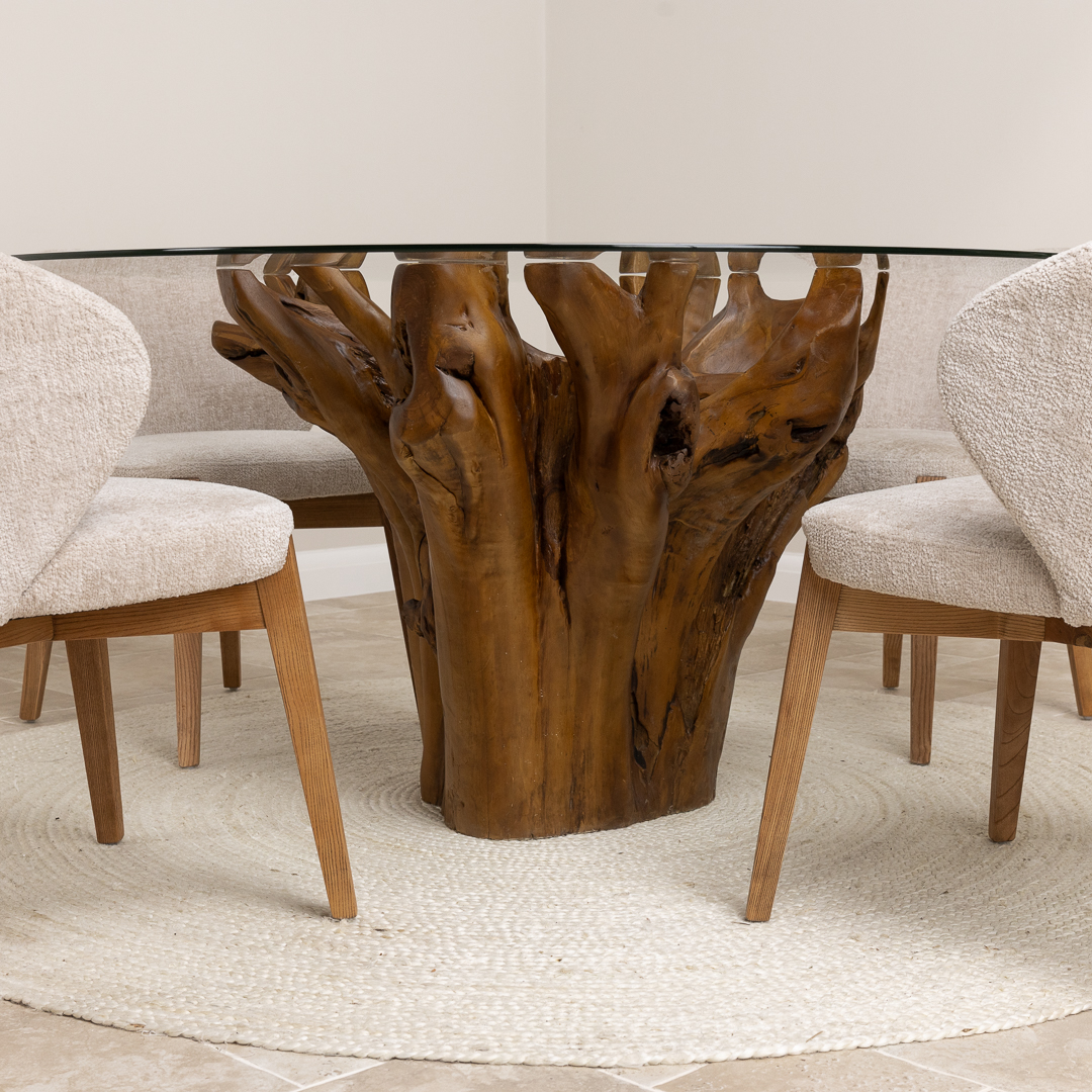 150cm Circular Reclaimed Teak Root Piece Dining Table with 10mm Toughened Safety GlassIn stock