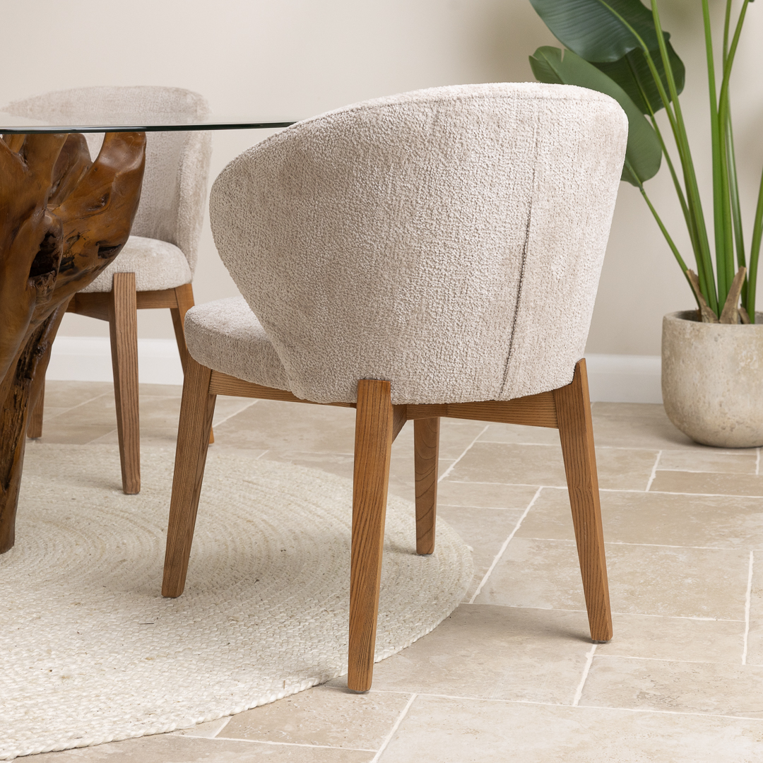180cm Circular Teak Flute Root Dining Table with 6 Upholstered Cove ChairsIn stock
