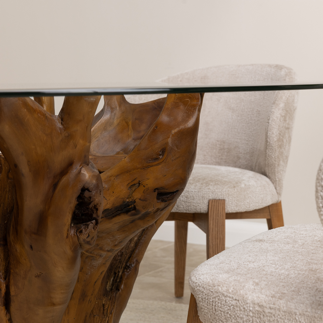 180cm x 120cm Oval Reclaimed Teak Root Indoor Dining Table with 10mm Toughened Safety GlassIn stock
