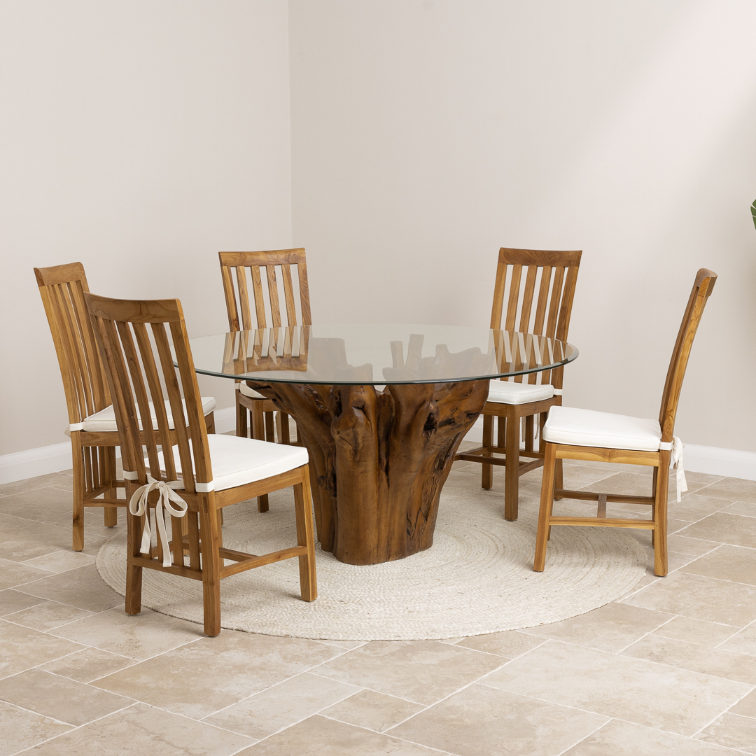 120cm Circular Teak Root Piece Dining Table with 4 Upholstered Cove ChairsIn stock
