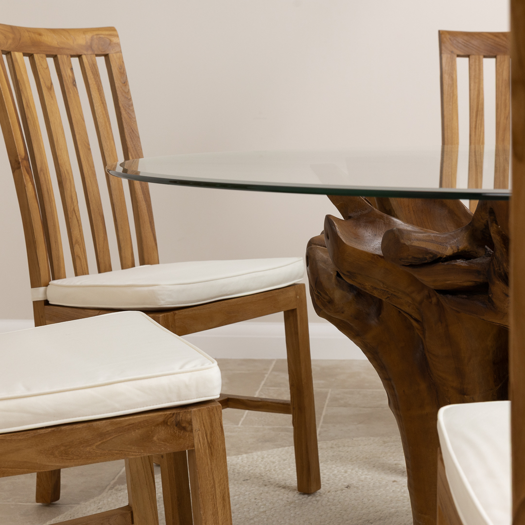 120cm Circular Reclaimed Teak Root Piece Dining Table with 10mm Toughened Safety GlassIn stock
