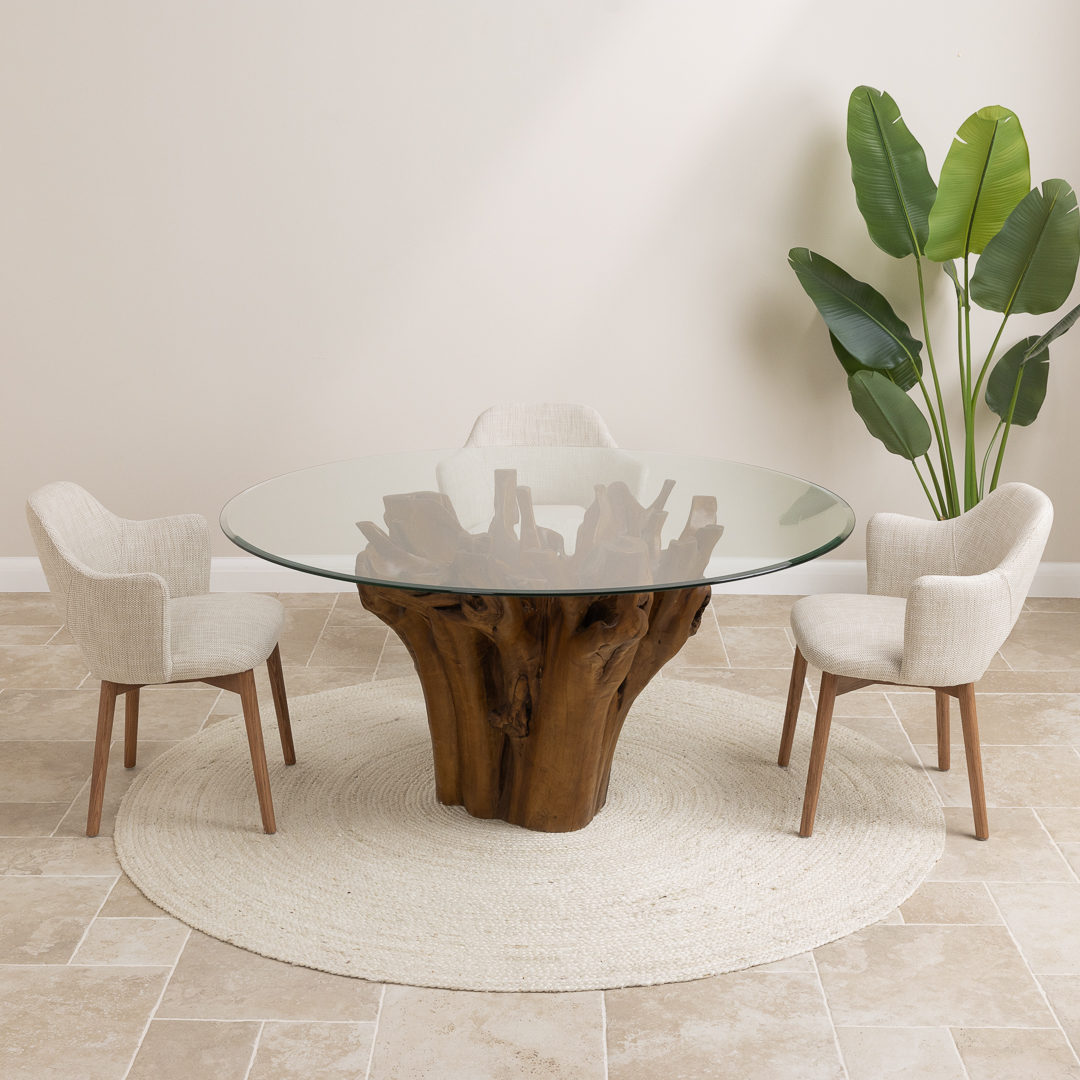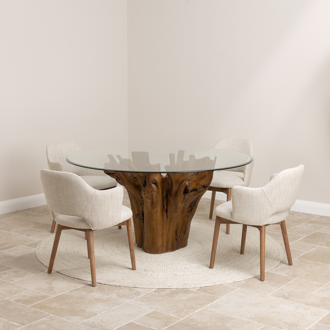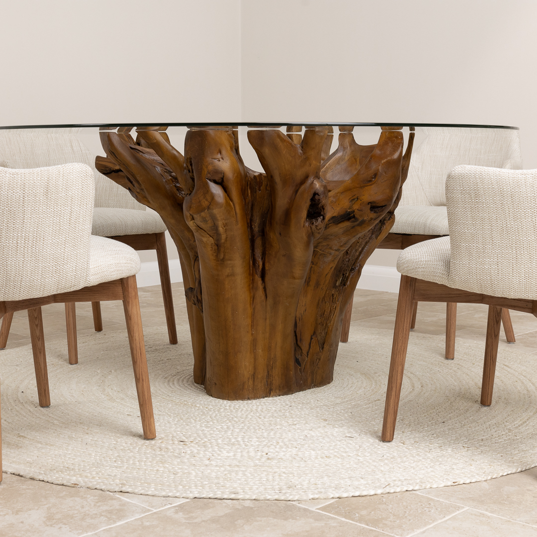150cm Circular Teak Root Piece Dining Table with 6 Upholstered Cove ChairsIn stock