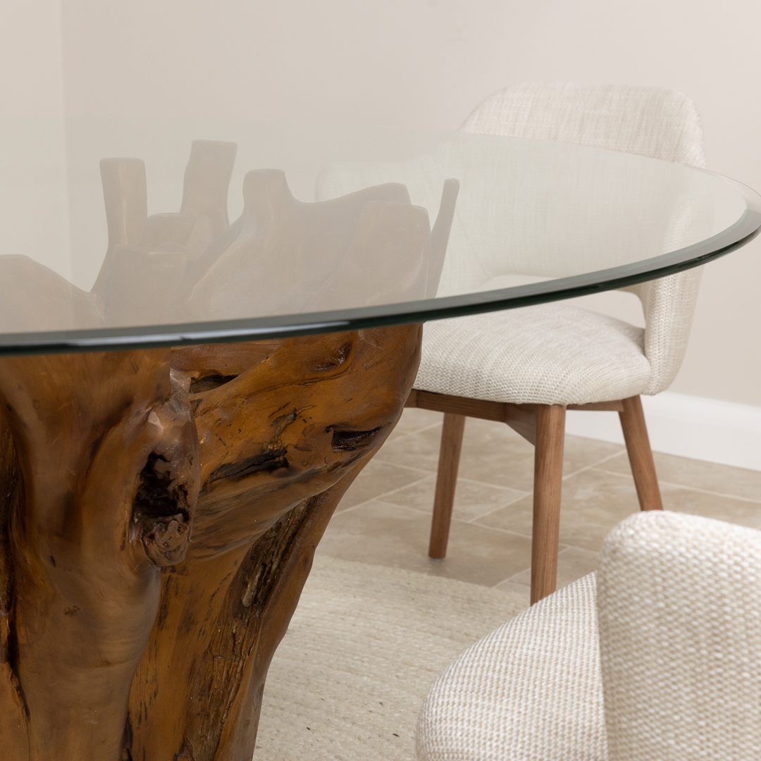 180cm x 120cm Oval Reclaimed Teak Root Indoor Dining Table with 10mm Toughened Safety GlassIn stock
