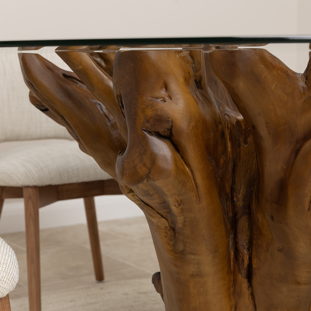 150cm Circular Reclaimed Teak Root Piece Dining Table with 10mm Toughened Safety GlassIn stock