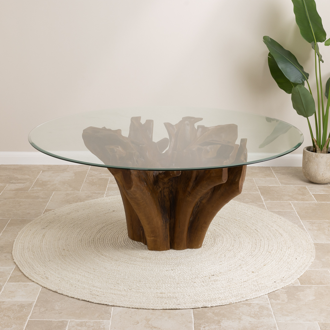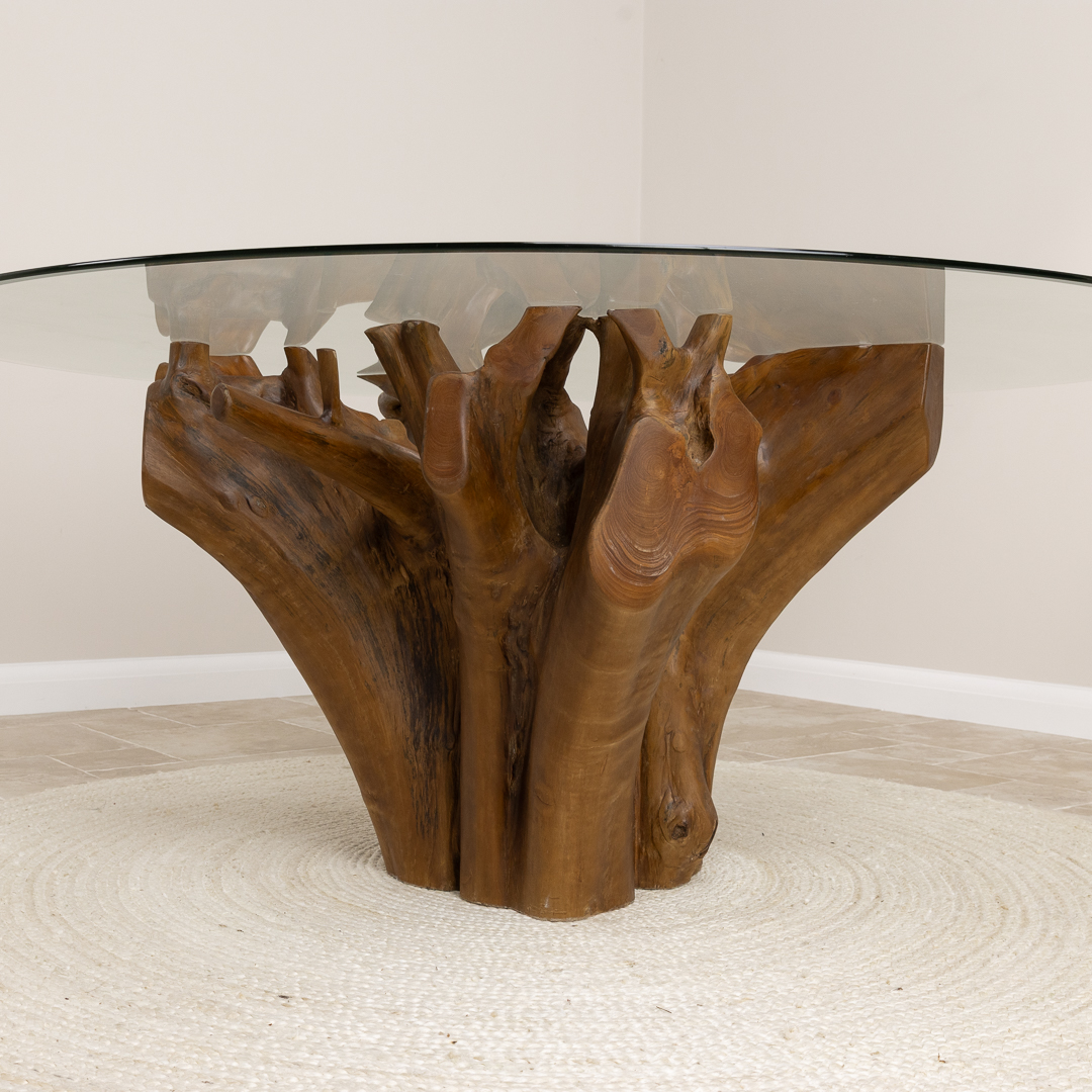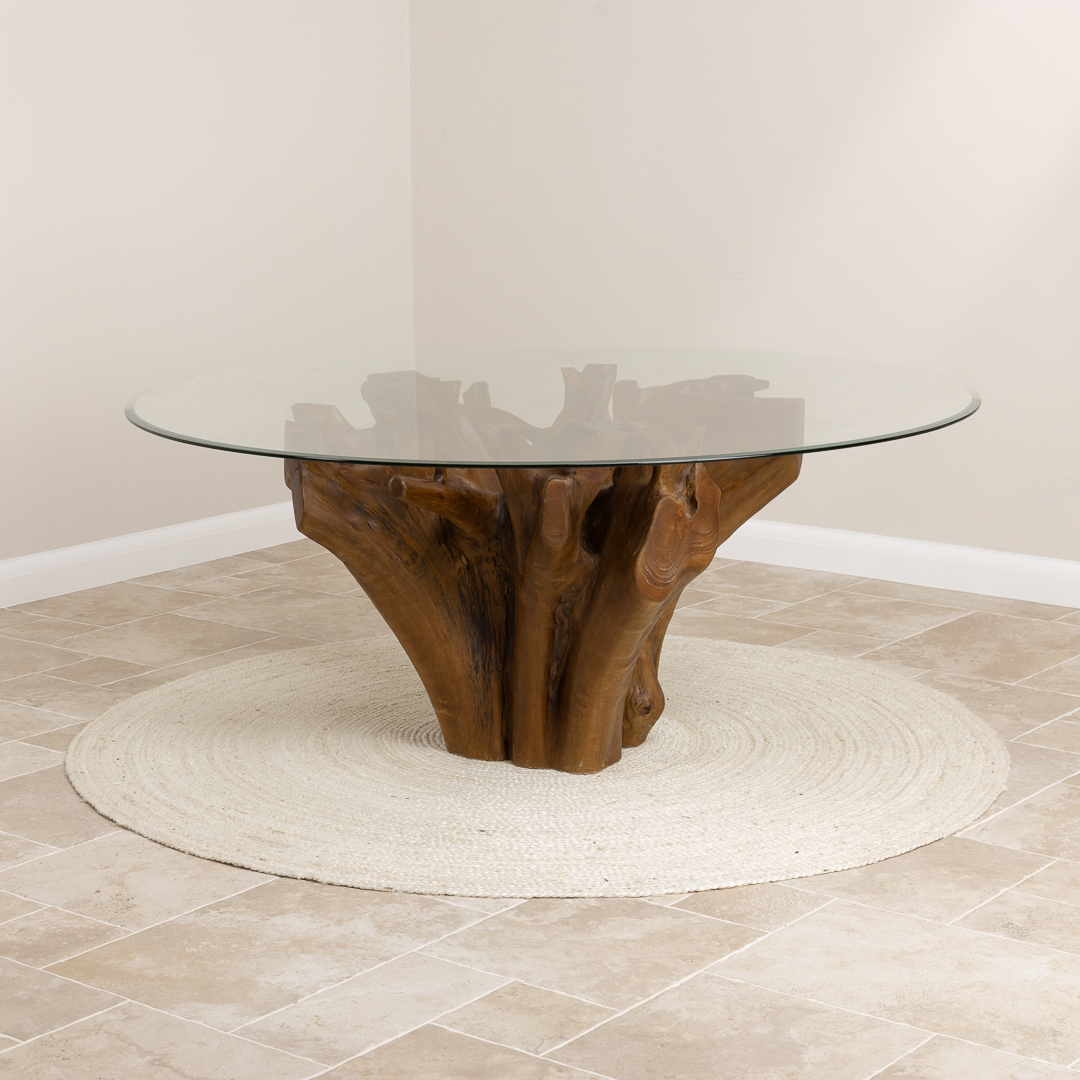 150cm Circular Reclaimed Teak Root Piece Dining Table with 10mm Toughened Safety GlassIn stock