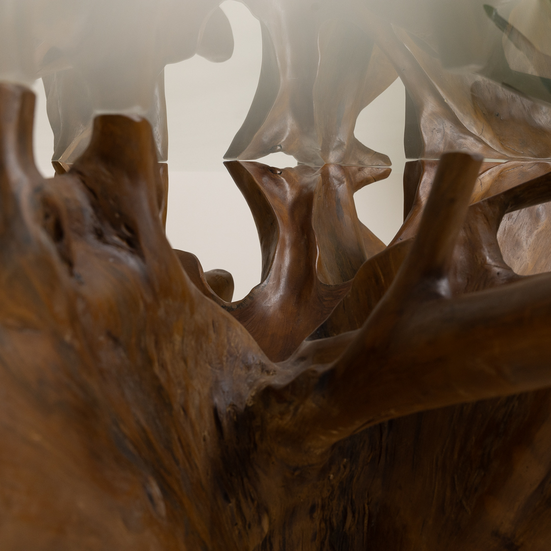 120cm Circular Reclaimed Teak Root Piece Dining Table with 10mm Toughened Safety GlassIn stock