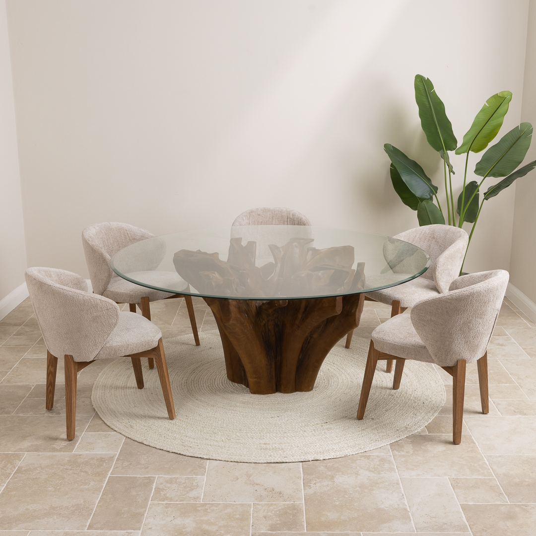 150cm Circular Teak Root Piece Dining Table with 6 Upholstered Cove ChairsIn stock