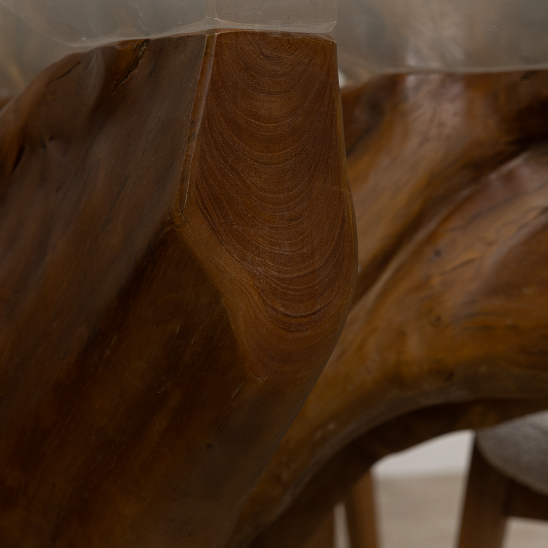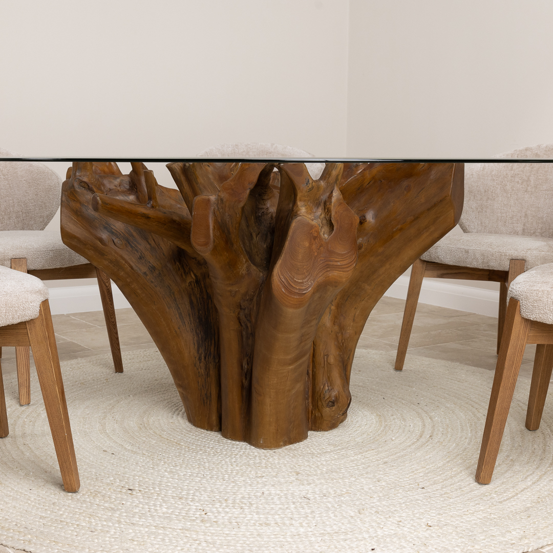 150cm Circular Reclaimed Teak Root Piece Dining Table with 10mm Toughened Safety GlassIn stock