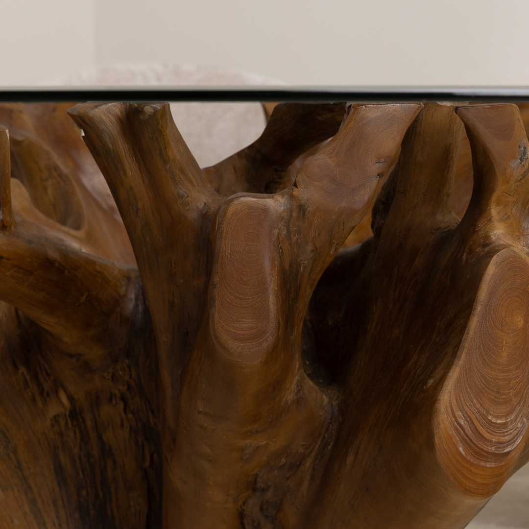 120cm Square Reclaimed Teak Root Cross Sectional Coffee Table with 10mm Toughened Safety GlassIn stock