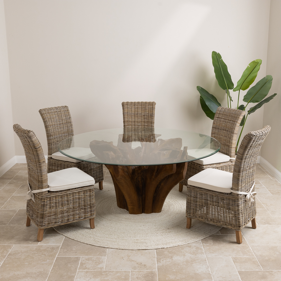 120cm Circular Teak Root Piece Dining Table with 4 Natural Kubu Wicker ChairsIn stock