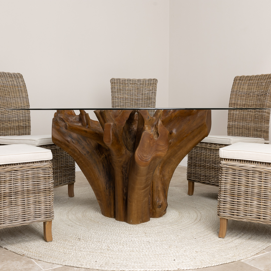 150cm Circular Reclaimed Teak Root Piece Dining Table with 10mm Toughened Safety GlassIn stock