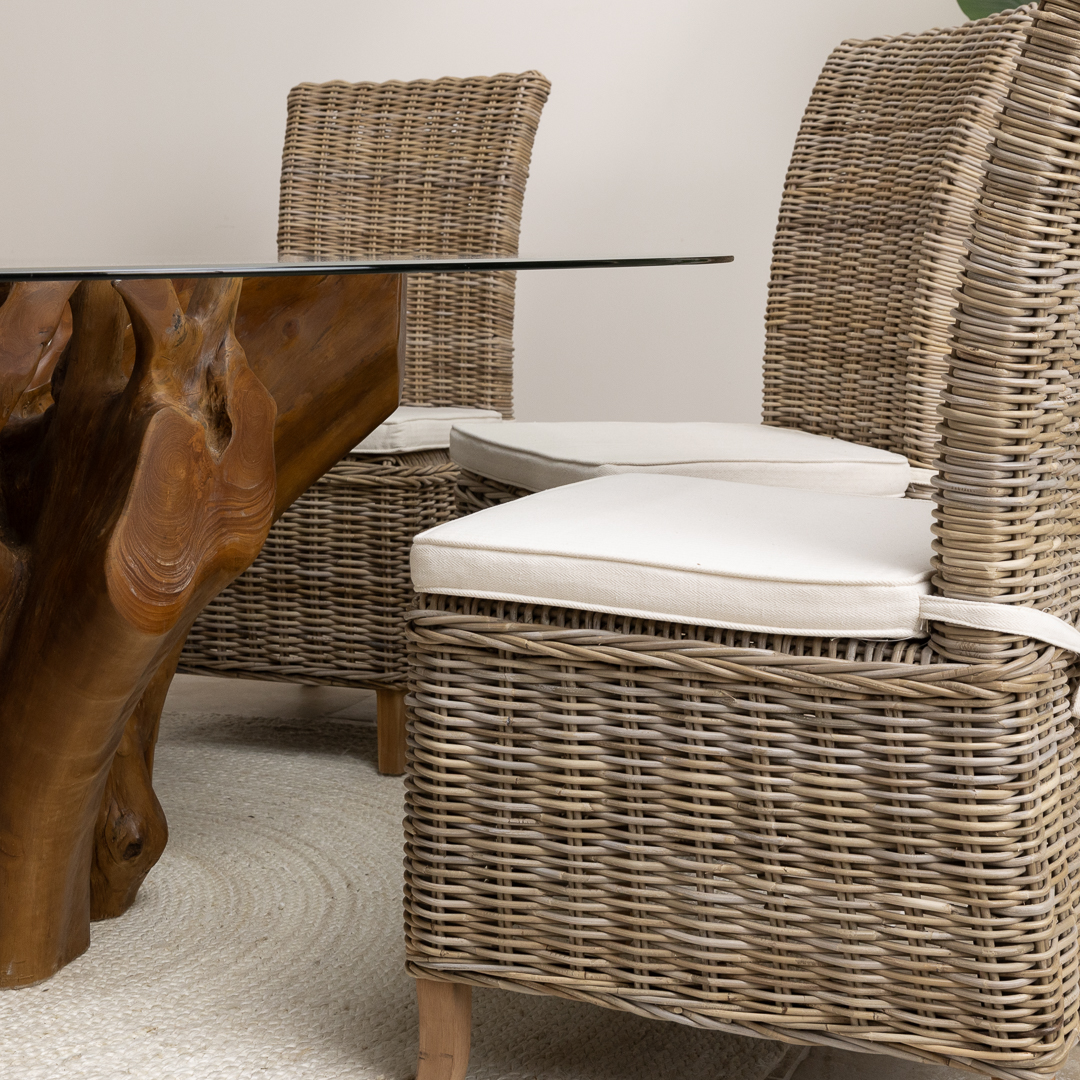 180cm x 120cm Rectangular Reclaimed Teak Root Indoor Dining Table with 4 or 6 Natural Kubu Wicker ChairsIn stock