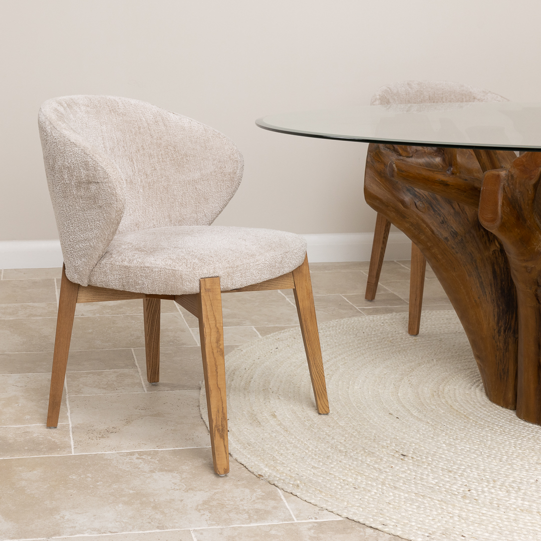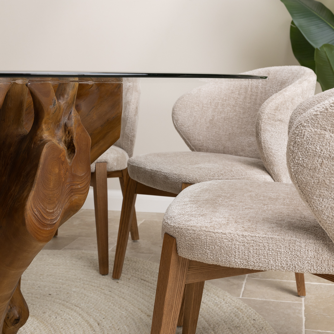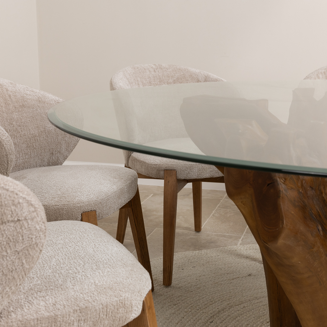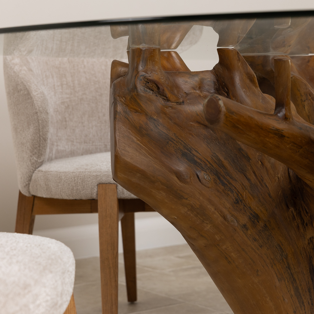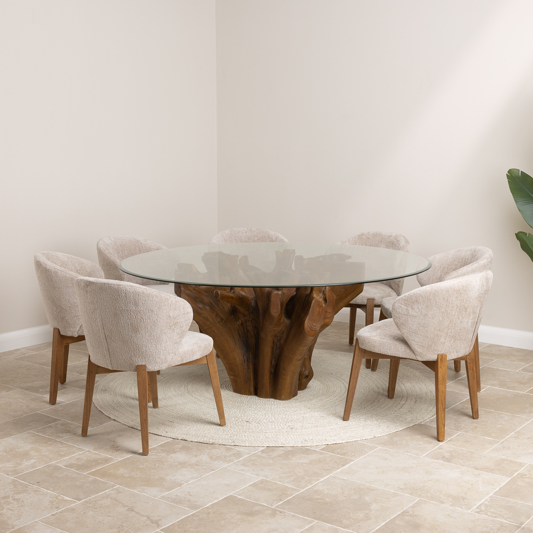 150cm Circular Teak Root Piece Dining Table with 6 Upholstered Cove ChairsIn stock