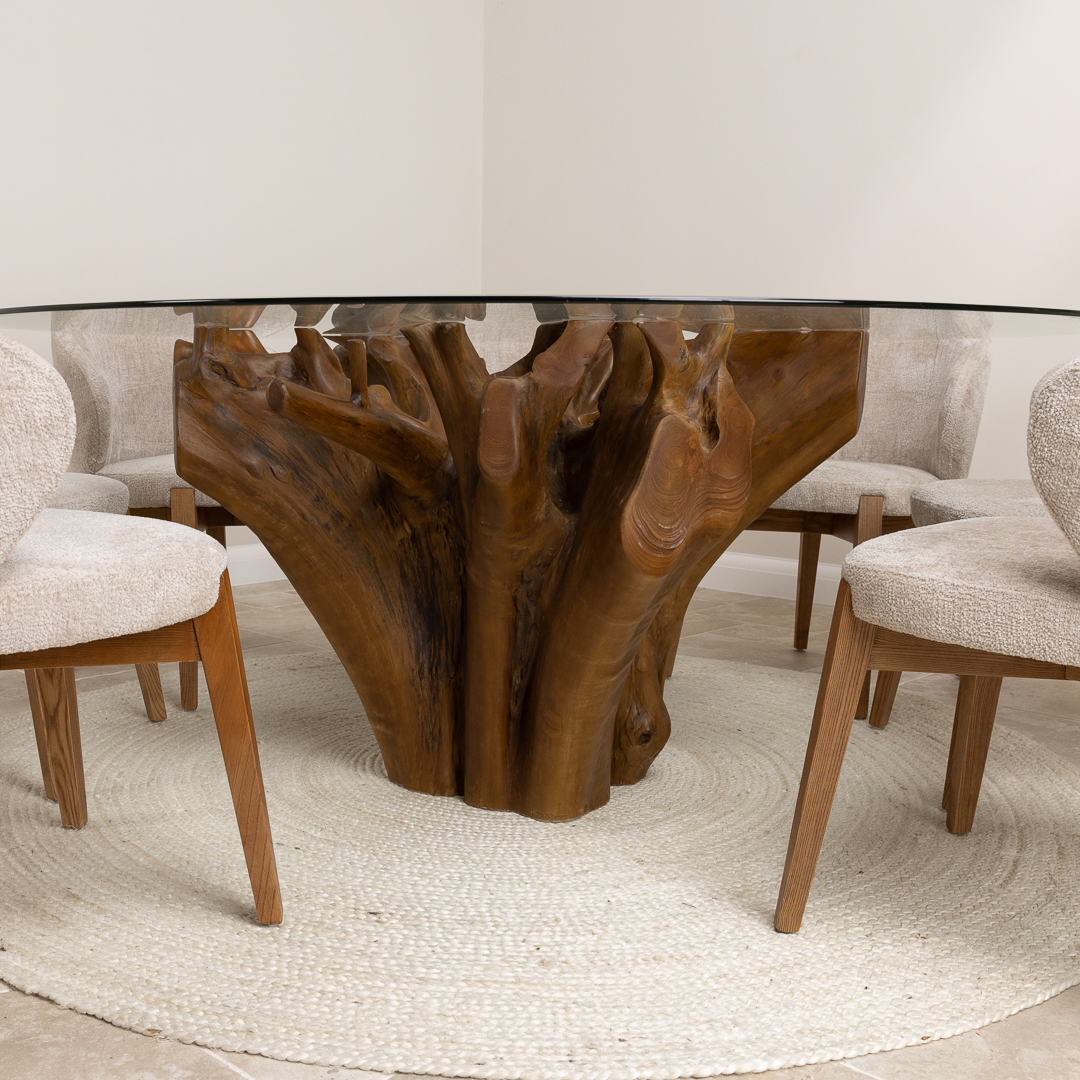 150cm Circular Reclaimed Teak Root Piece Dining Table with 10mm Toughened Safety GlassIn stock
