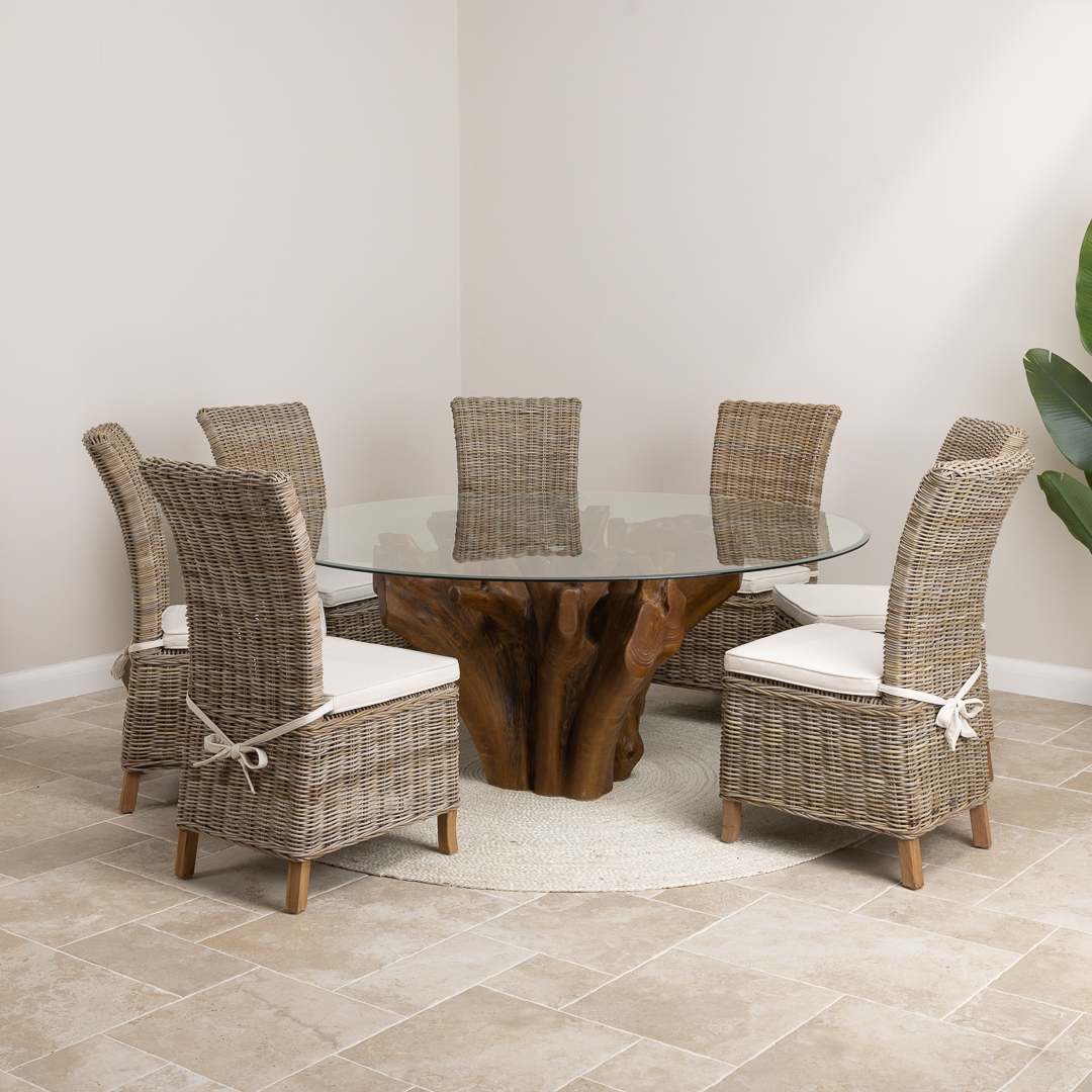 180cm Circular Reclaimed Teak Flute Root Indoor Dining Table with 6 Natural Kubu Wicker ChairsIn stock