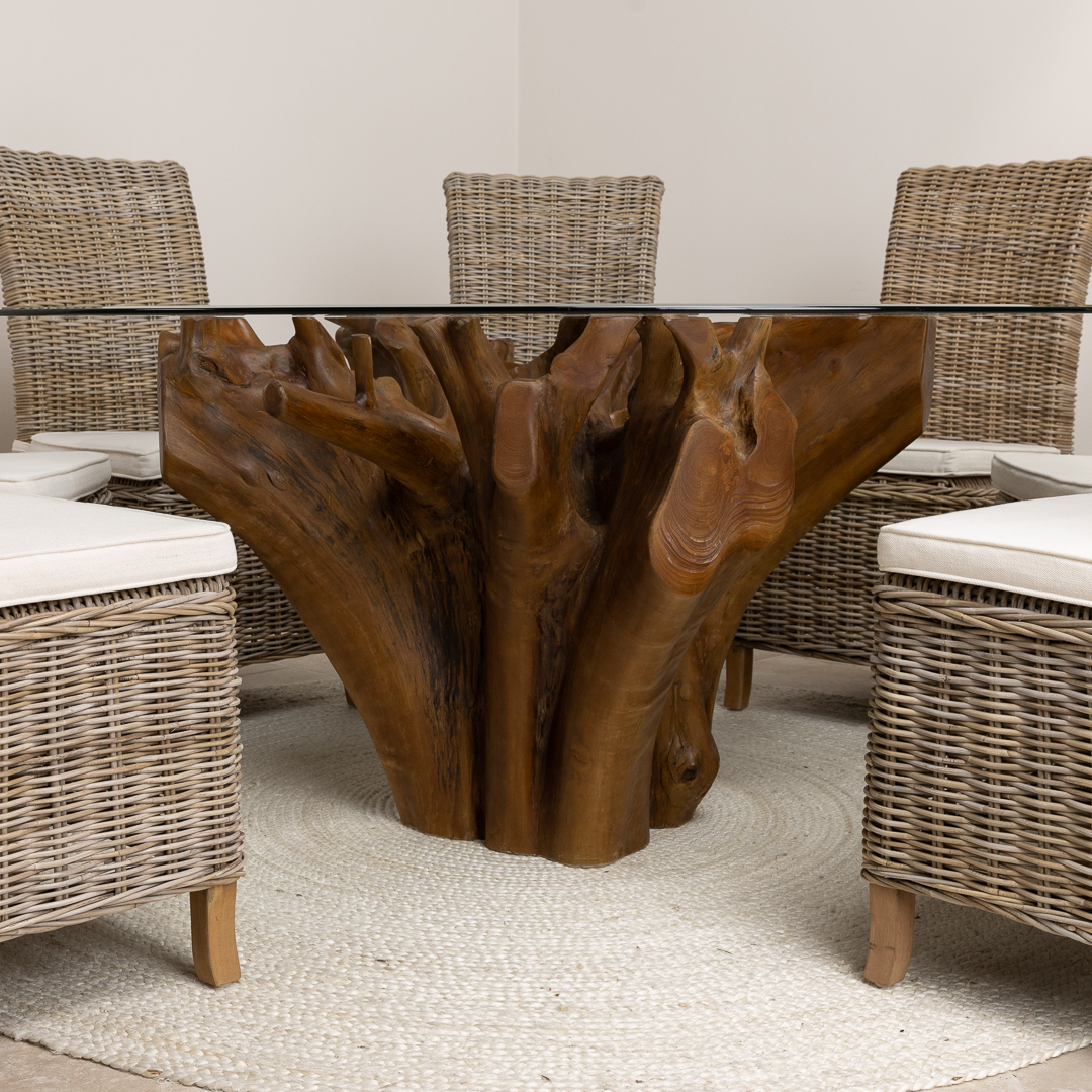 120cm Circular Teak Root Piece Dining Table with 4 Natural Kubu Wicker ChairsIn stock