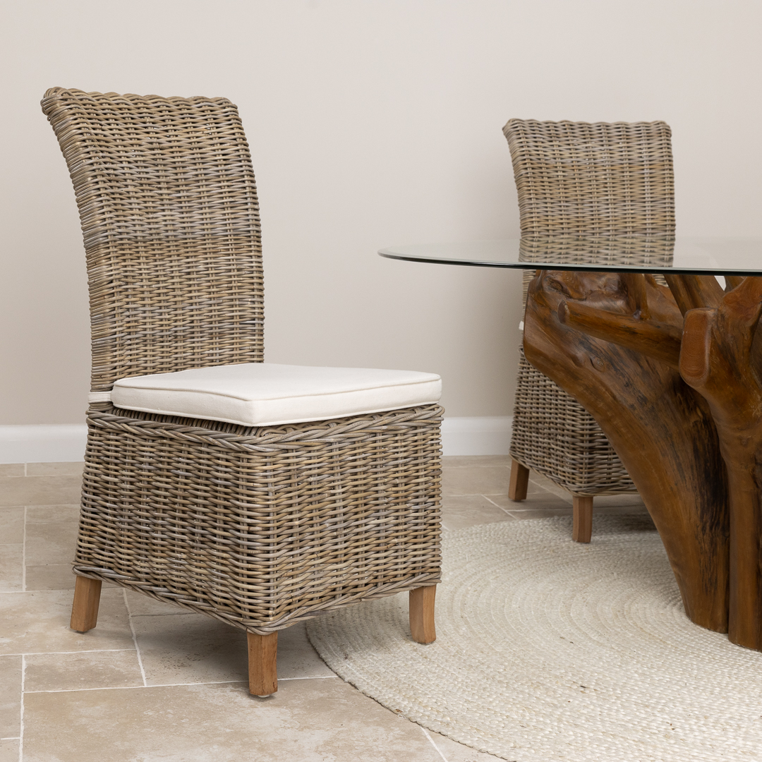 180cm x 120cm Rectangular Reclaimed Teak Root Indoor Dining Table with 4 or 6 Natural Kubu Wicker ChairsIn stock
