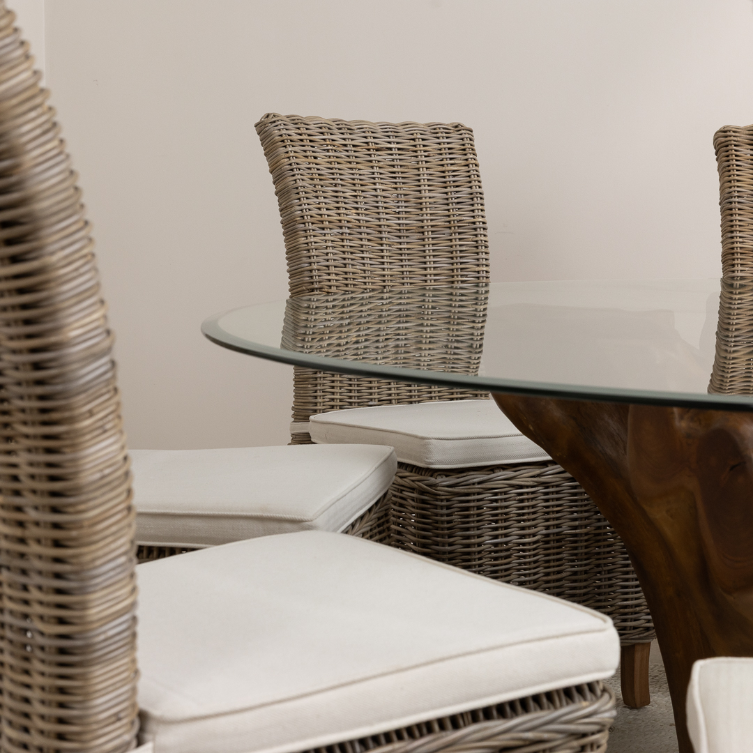 180cm x 120cm Oval Teak Root Dining Table with 6 Natural Kubu Wicker ChairsIn stock