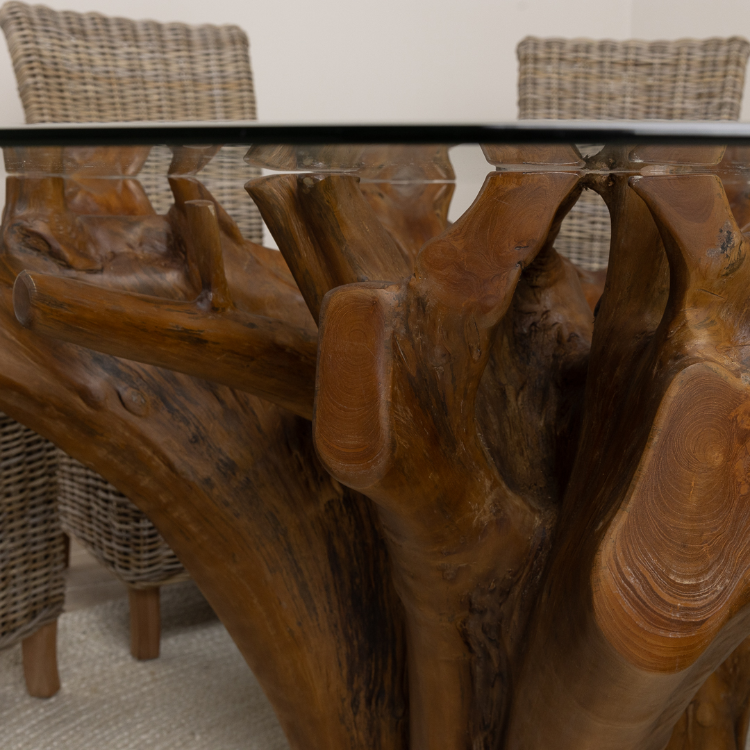 240cm x 120cm Rectangular Reclaimed Teak Root Indoor Dining Table with 10mm Toughened Safety GlassIn stock
