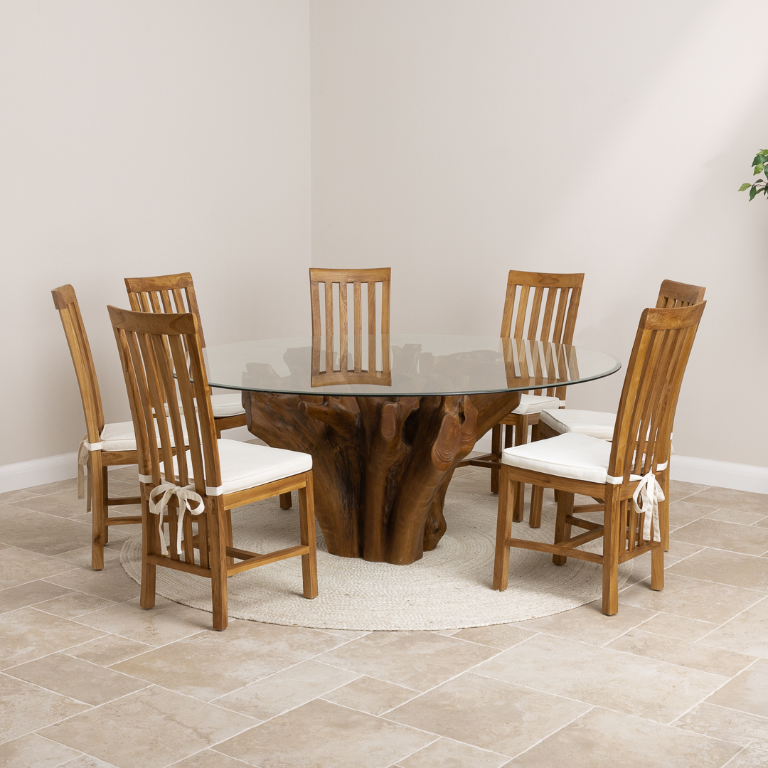 150cm Circular Teak Root Piece Dining Table with 6 Upholstered Cove ChairsIn stock