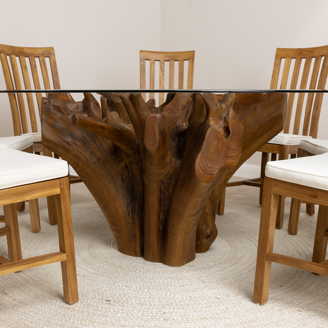 150cm Circular Reclaimed Teak Root Piece Dining Table with 10mm Toughened Safety GlassIn stock