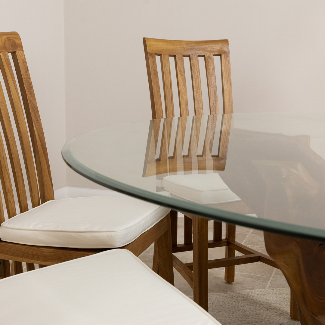 240cm x 120cm Oval Reclaimed Teak Root Indoor Dining Table with 10mm Toughened Safety GlassIn stock