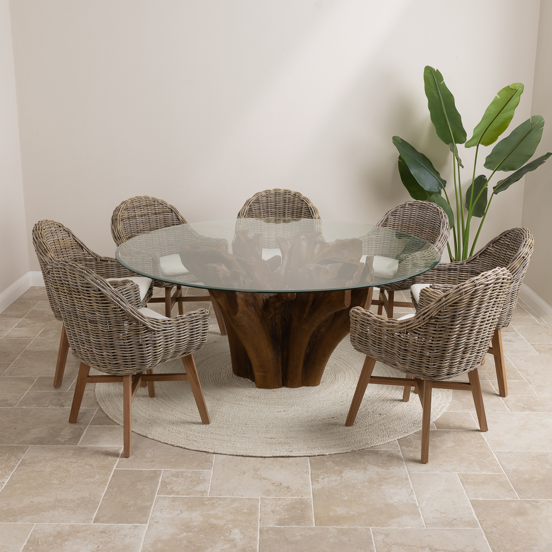 180cm Circular Reclaimed Teak Flute Root Indoor Dining Table with 6 Natural Kubu Wicker ChairsIn stock