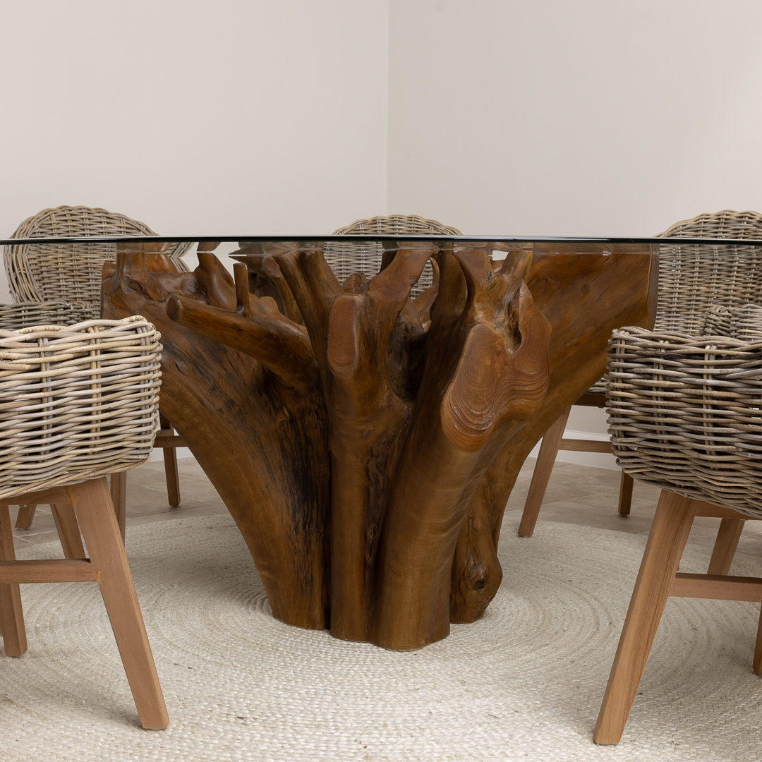 150cm Circular Reclaimed Teak Root Piece Dining Table with 10mm Toughened Safety GlassIn stock