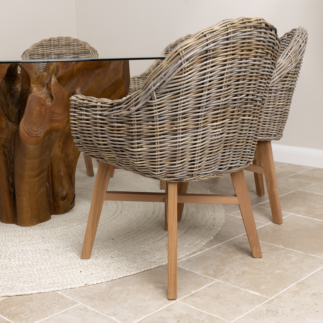 180cm x 120cm Rectangular Reclaimed Teak Root Indoor Dining Table with 4 or 6 Natural Kubu Wicker ChairsIn stock