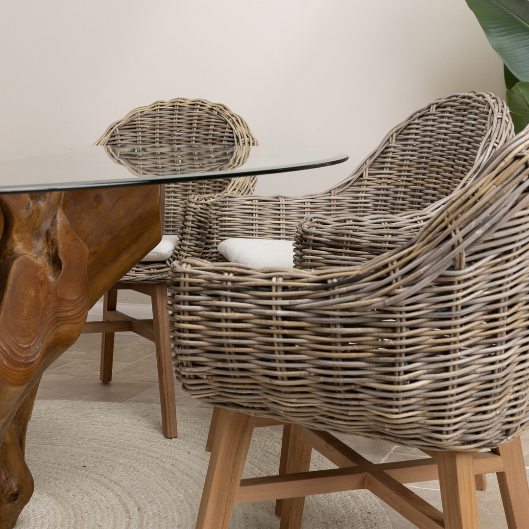 120cm Circular Teak Root Piece Dining Table with 4 Natural Kubu Wicker ChairsIn stock