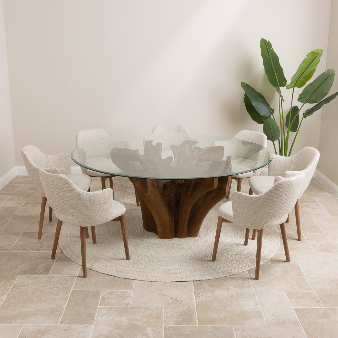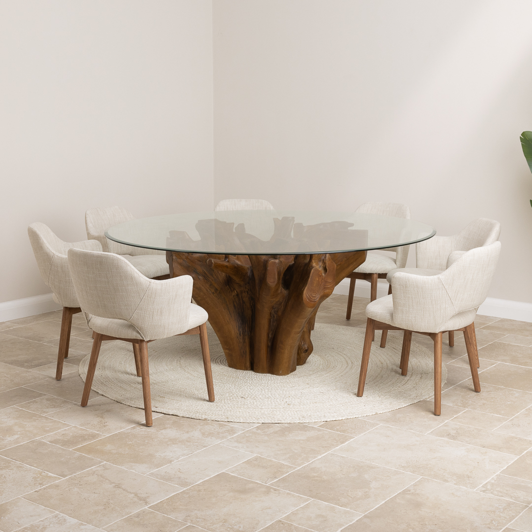 150cm Circular Teak Root Piece Dining Table with 6 Upholstered Cove ChairsIn stock