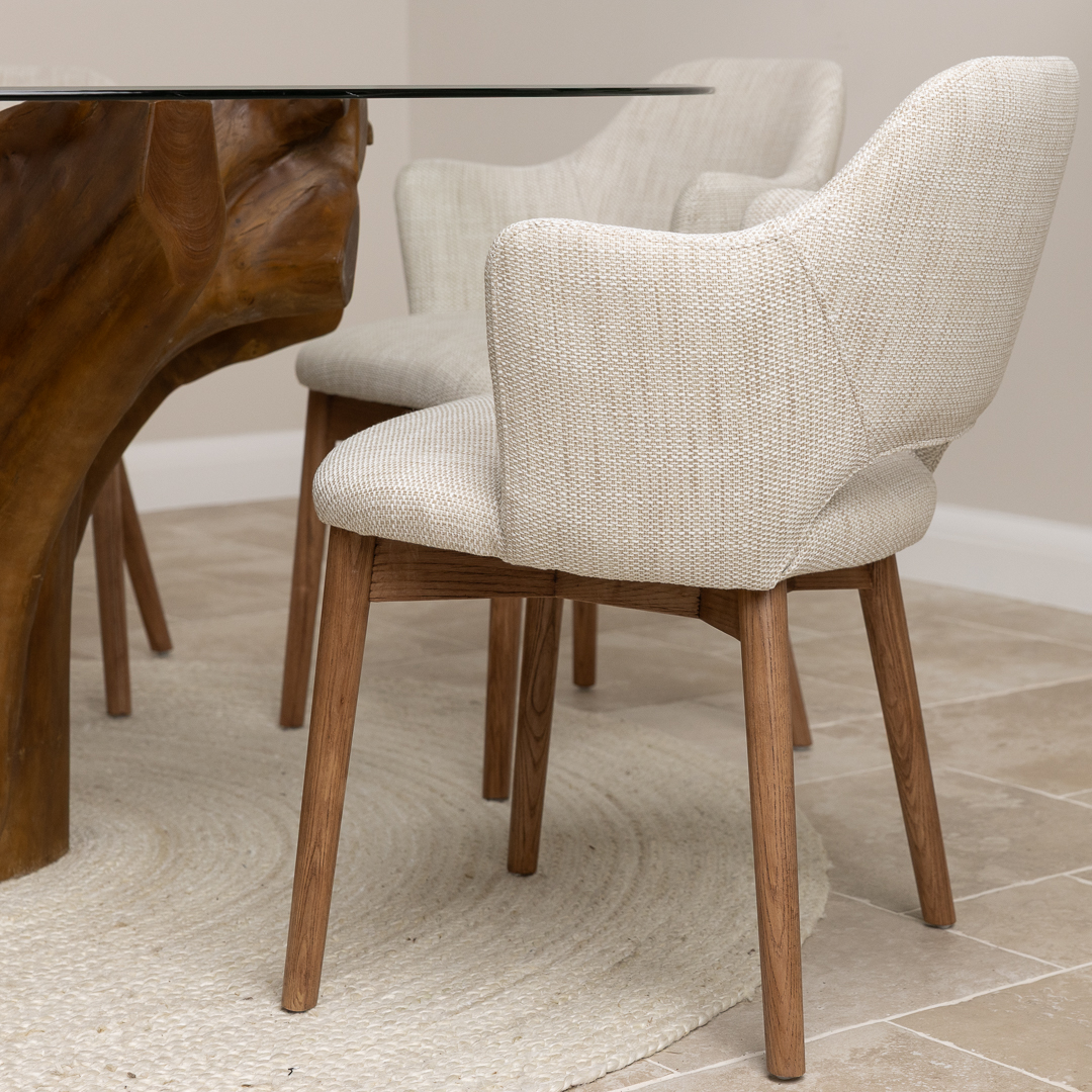 180cm x 120cm Oval Teak Root Dining Table with 6 Scandi ArmchairsIn stock