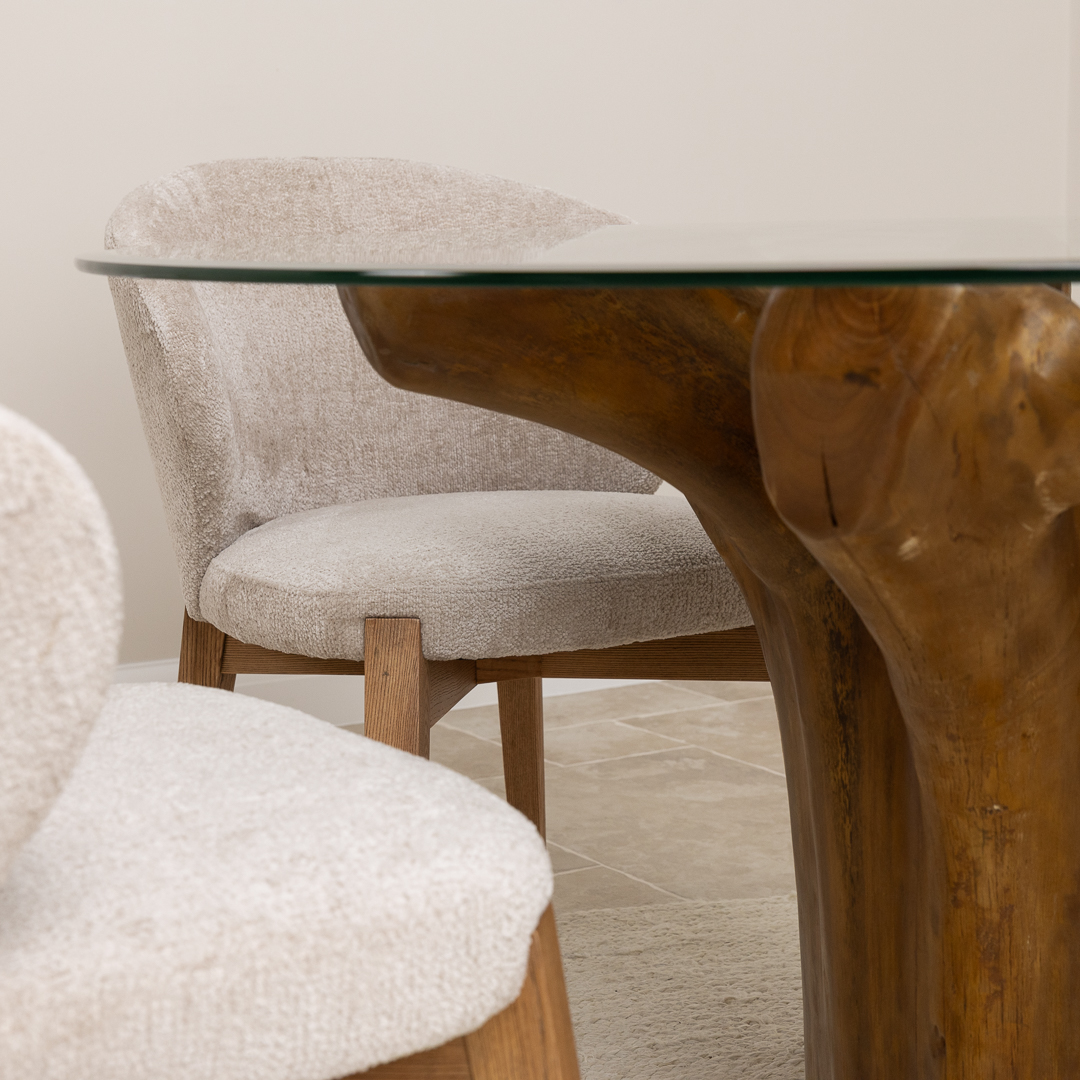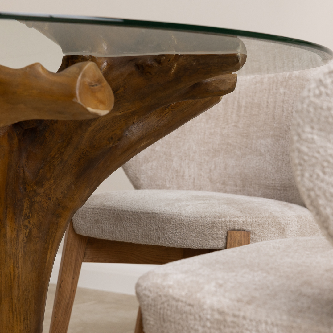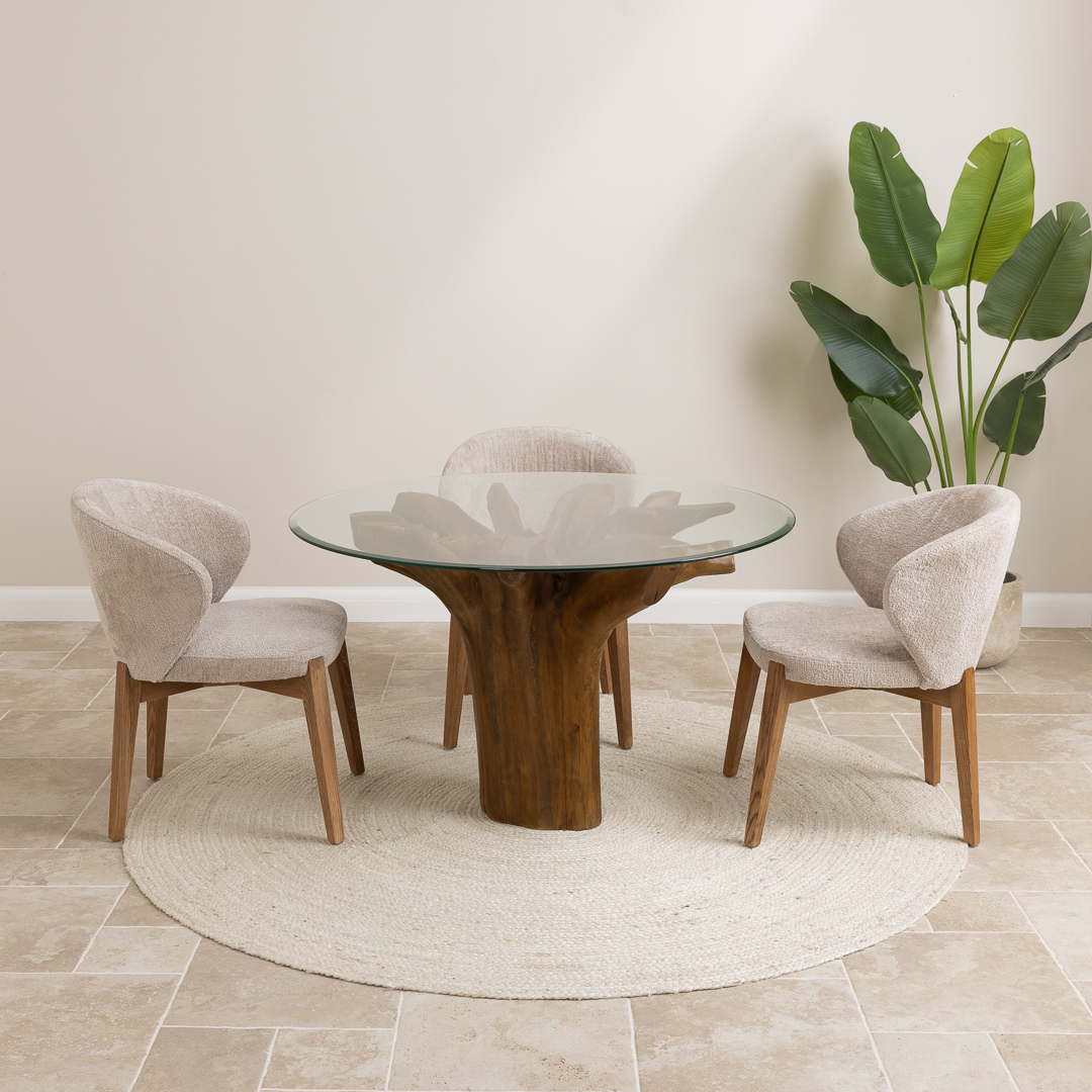 150cm Circular Teak Root Piece Dining Table with 6 Upholstered Cove ChairsIn stock
